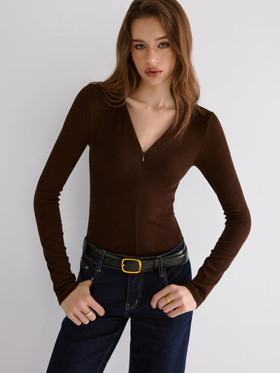 Belt Strap Detail Asymmetric Rib-Knit Top