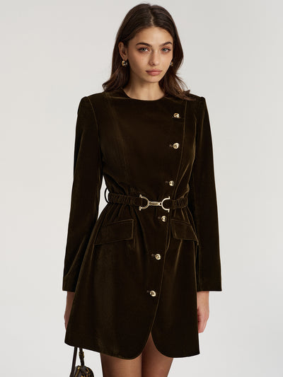 Belted Asymmetric Button Velvet Long Blazer