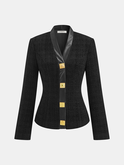 Faux Leather Trim Metal Button Tweed Blazer