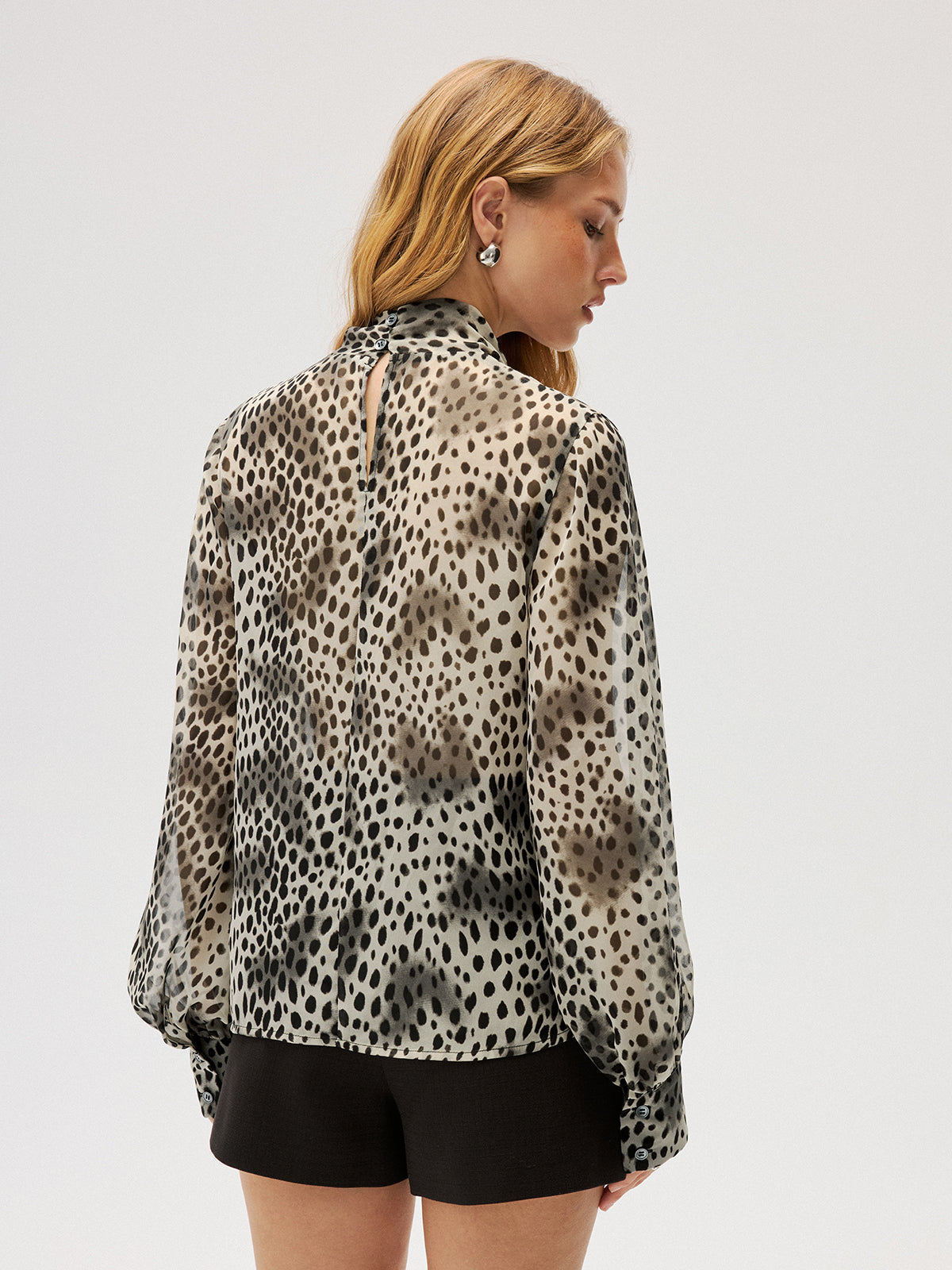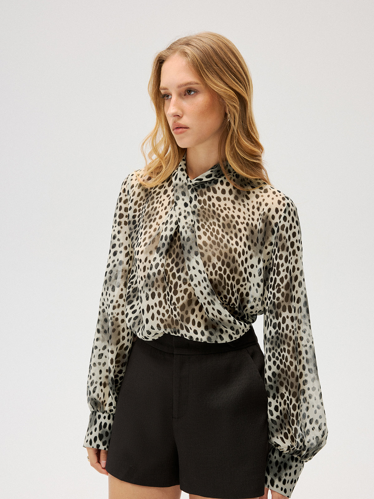 Semi-Sheer Chiffon Leopard Print Tie Neck Shirt