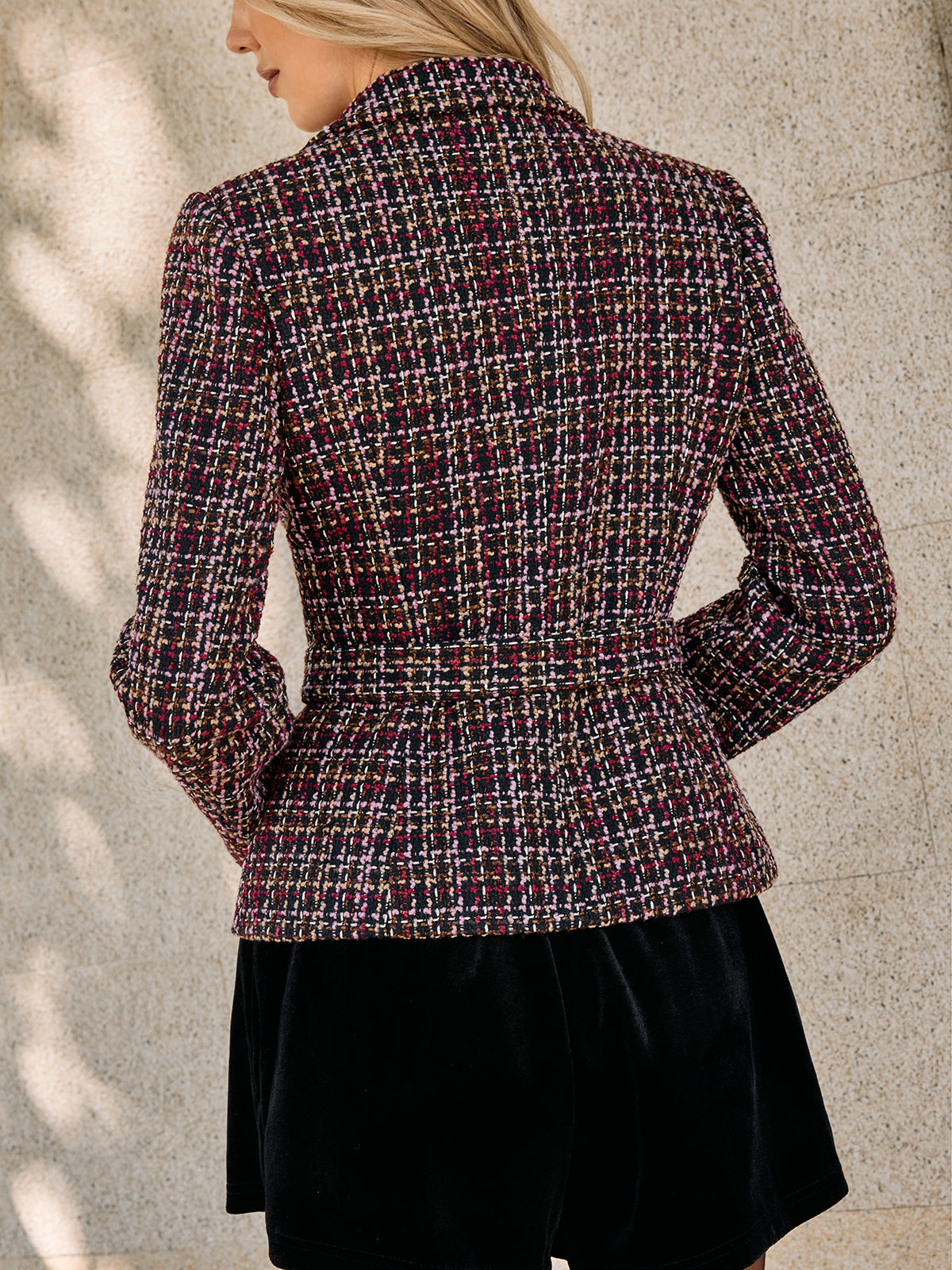 blazers,casual,cici select,clothing,coll:blazers,coll:outerwear,coll:plaids_polka,coll:tops,coll:trending,coll:vintage_fabrics,corpcore,fall,feminine,in_six_month,long sleeve,multicolor,non-stretch,not_low_sales,oa251029038,outerwear,photo_model,plaid,regular,regular fit,spring,tweed,winter,winter hues,women