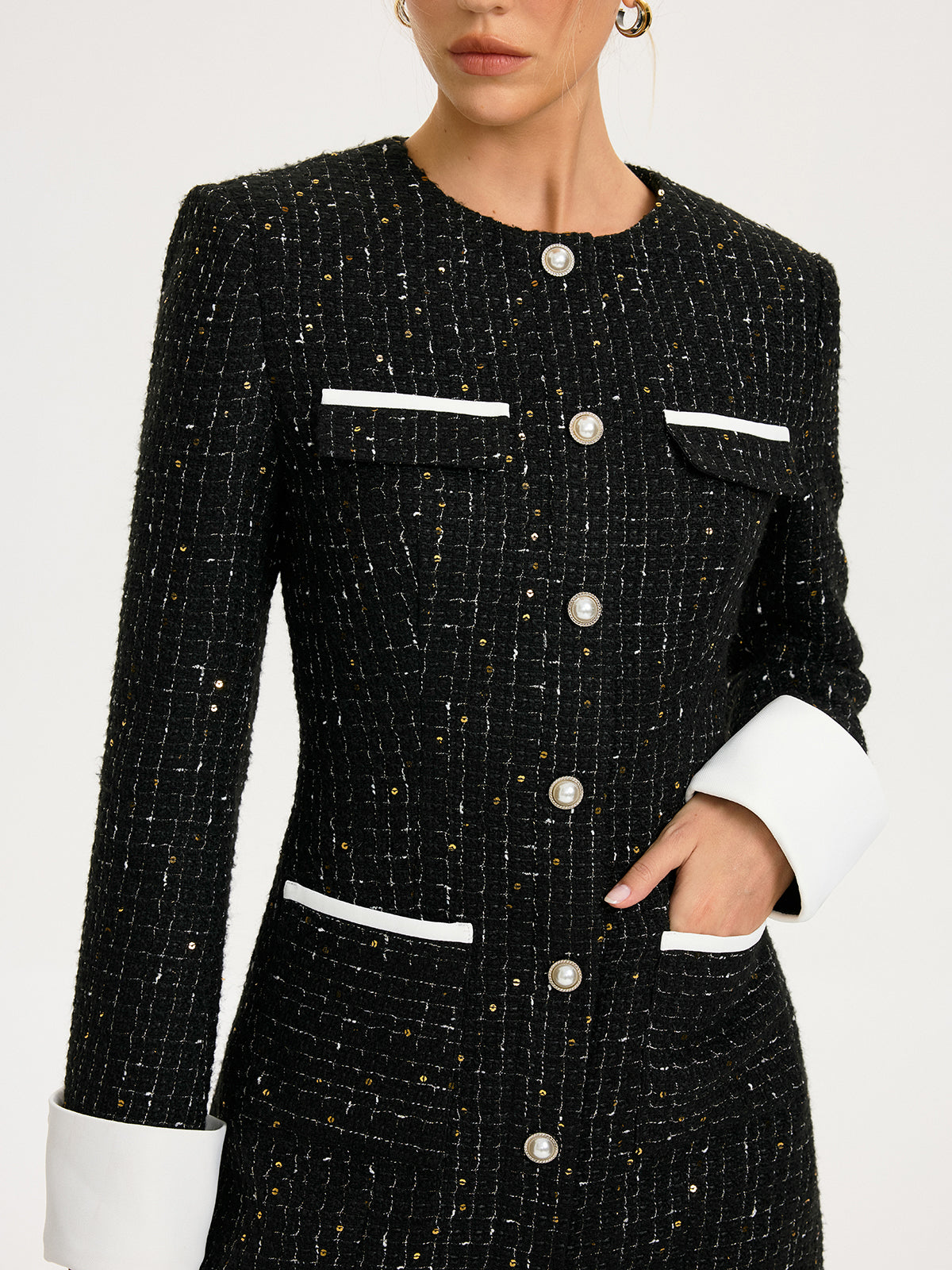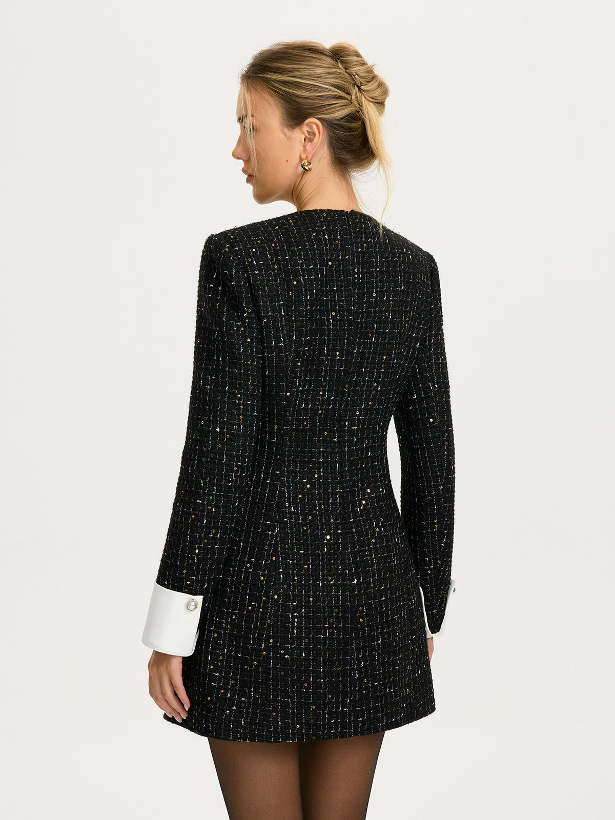 black,clothing,coll:dresses,coll:vintage_fabrics,collar,corpcore,date,dresses,feminine,in_six_month,invisible zipper,long sleeve,metal detail,no,non-stretch,not_low_sales,oa251107048,patchwork,photo_model,regular,regular fit,short,tweed,women