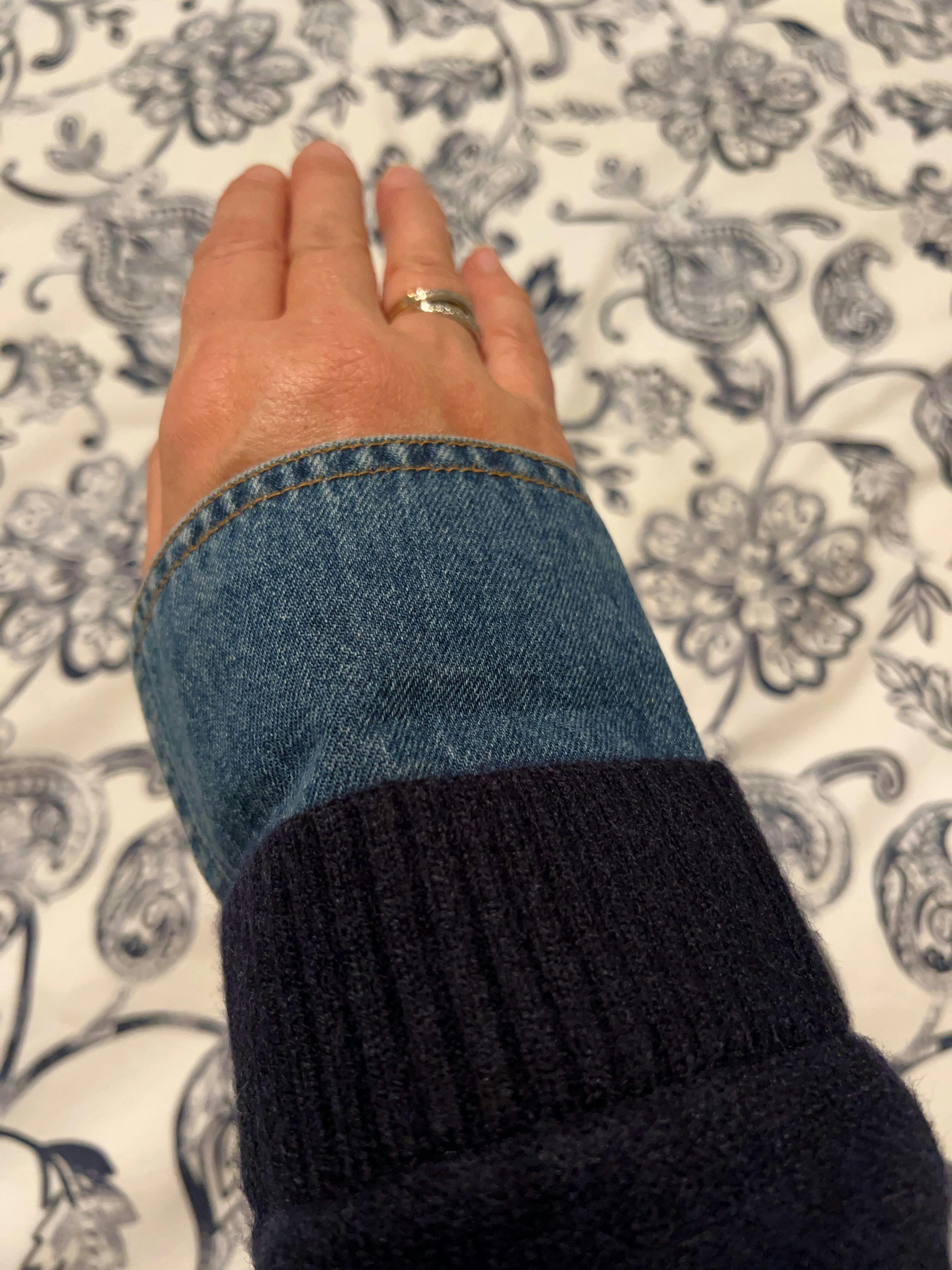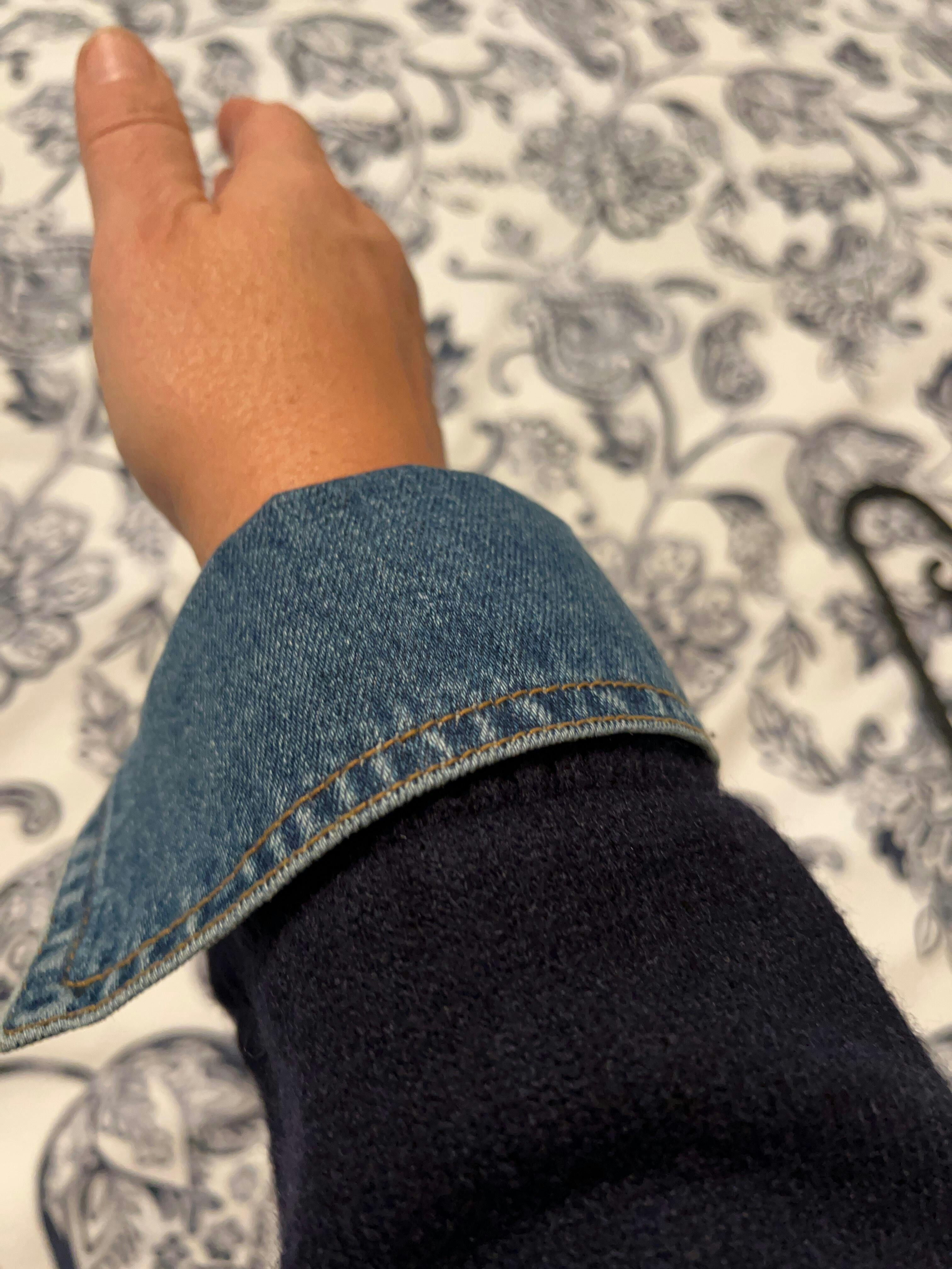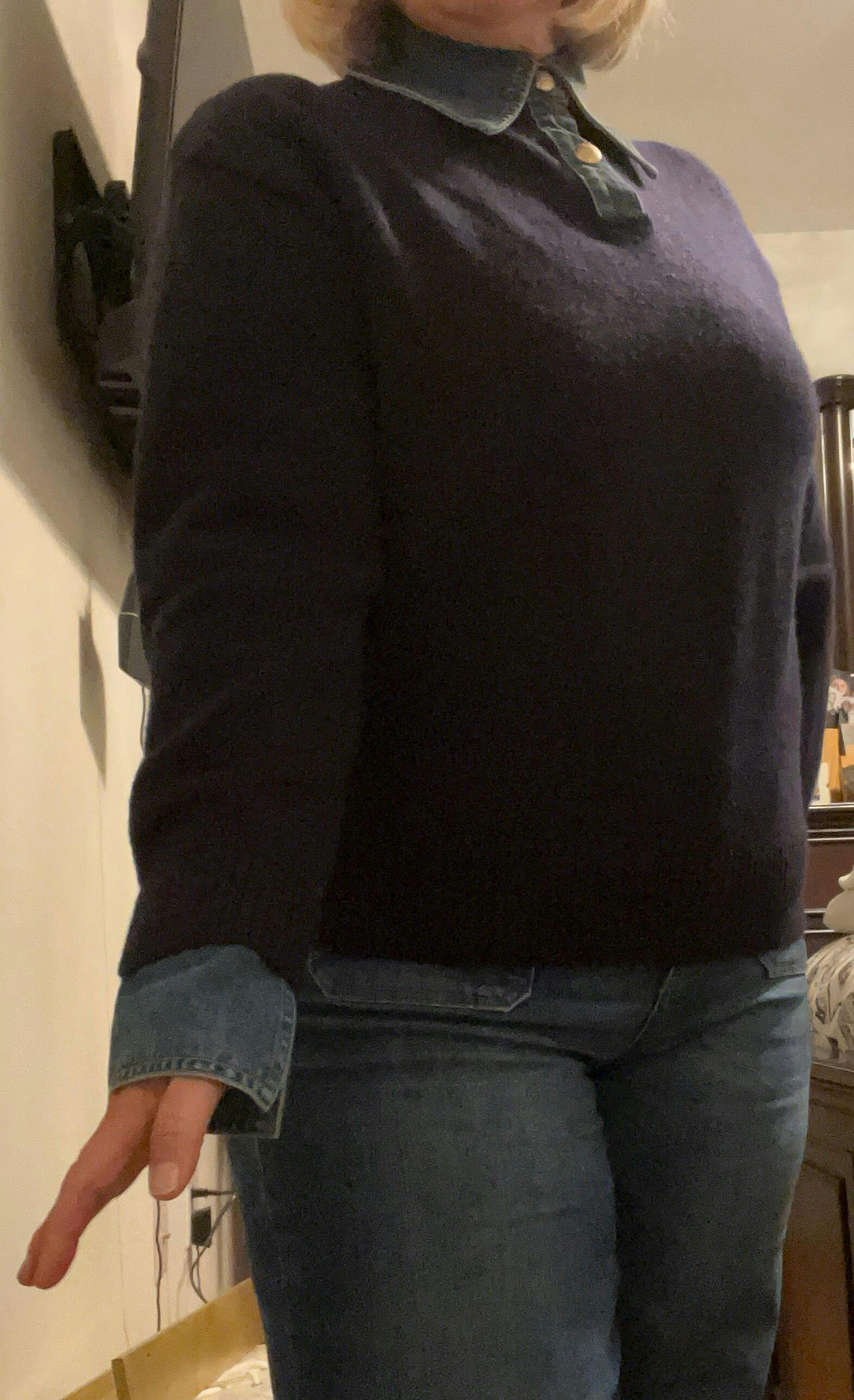 Love this! I was a bit uncertain at first but ended up succumbing to this lovely sweater. I bought the navy in large, but had to size down. Customer service was fantastic and very helpful, and I received my new one quickly. The sweater is of a luxurious quality, soft and well made. The sleeves are finished nicely as is the bottom. The denim cuffs are also a great quality and matched my jeans perfectly! The gold buttons add just the right amount of “pop” to the sweater. The collar is a bit larger than I’m used to but it still works well. Honestly, I am very impressed with the quality and so very pleased with my purchase! Gifted one to a friend and she loved hers, too! I’m considering buying a different colour, now!