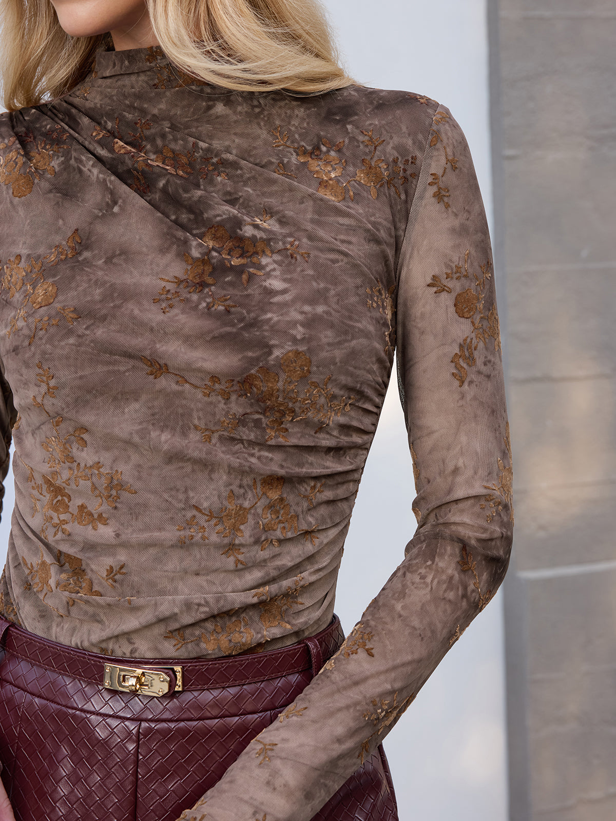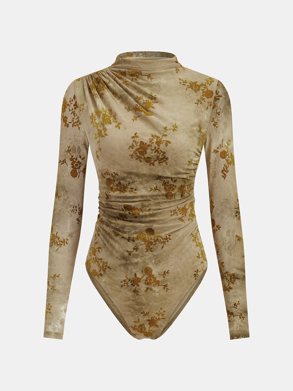 Floral Jacquard Ruched Mock-Neck Bodysuit