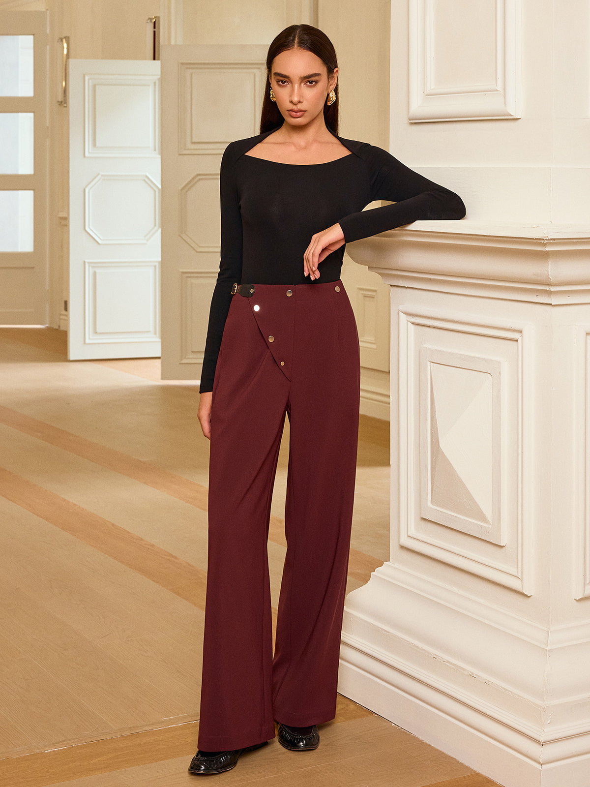 bottoms,burgundy,casual,clothing,coll-2025-10-20,coll:bottoms,coll:pants,coll:trending,corpcore,elevated winter closet,fall,in_six_month,inner sample,long pants,metal detail,mid waist,minegence,no,non-stretch,not_low_sales,oa250815035,pants,photo_model,regular,regular fit,winter,women,woven fabric