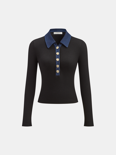 Contrast Collar Metal Button Ribbed Knit T-Shirt