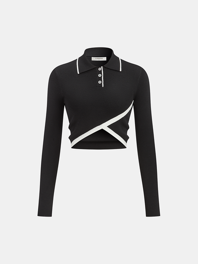 Asymmetric Contrast Trim Wool Blend Cropped Polo Top