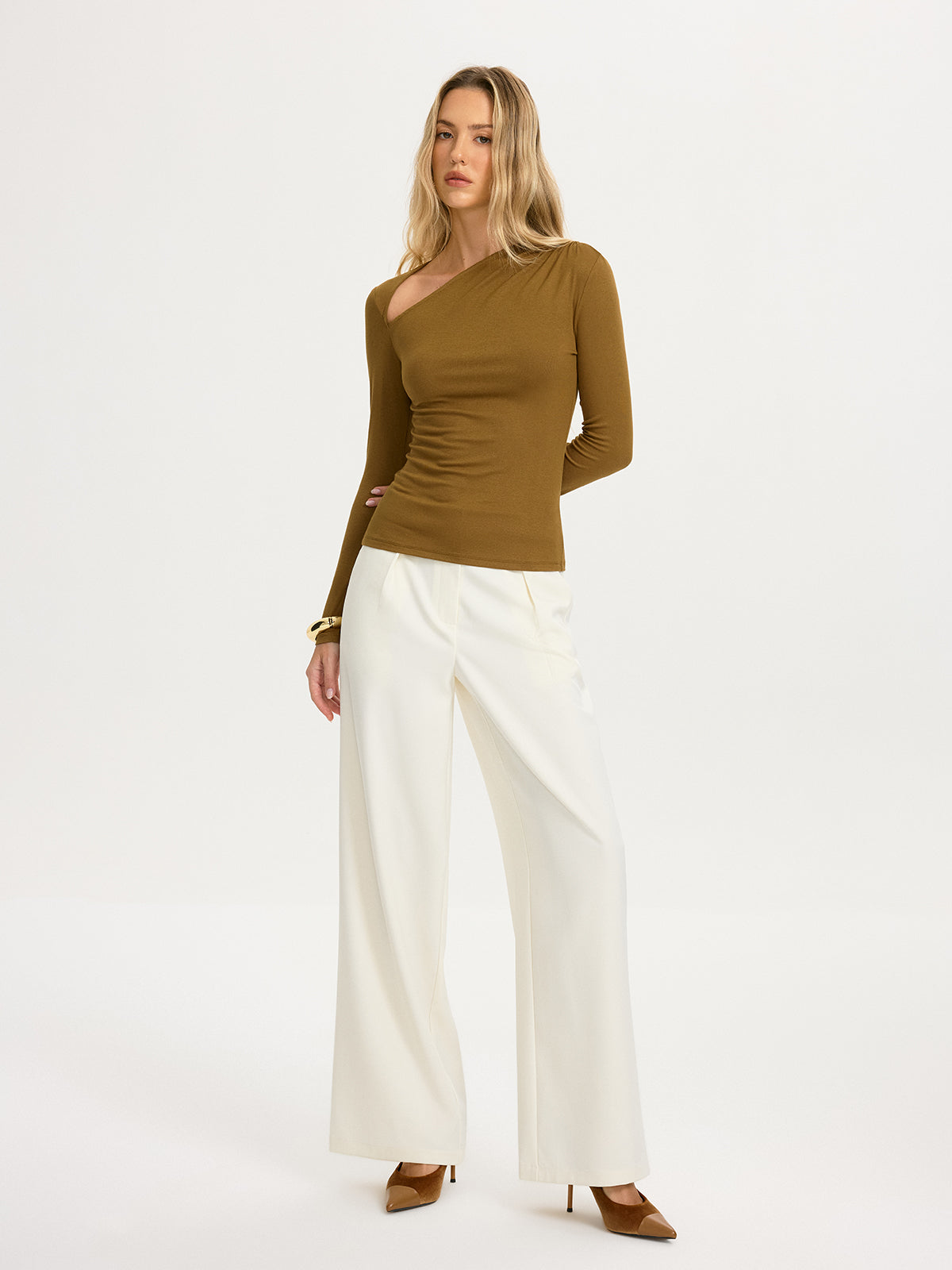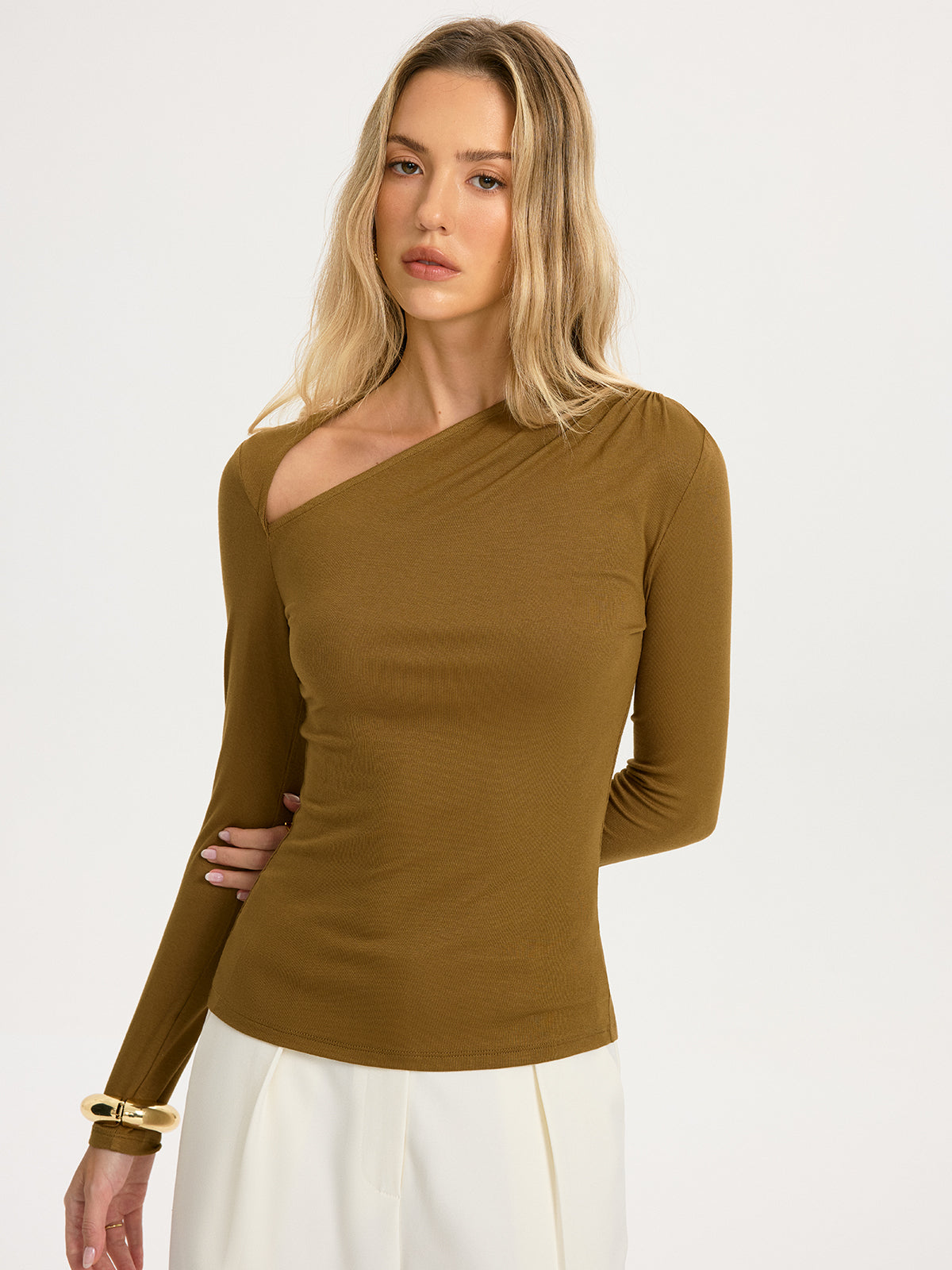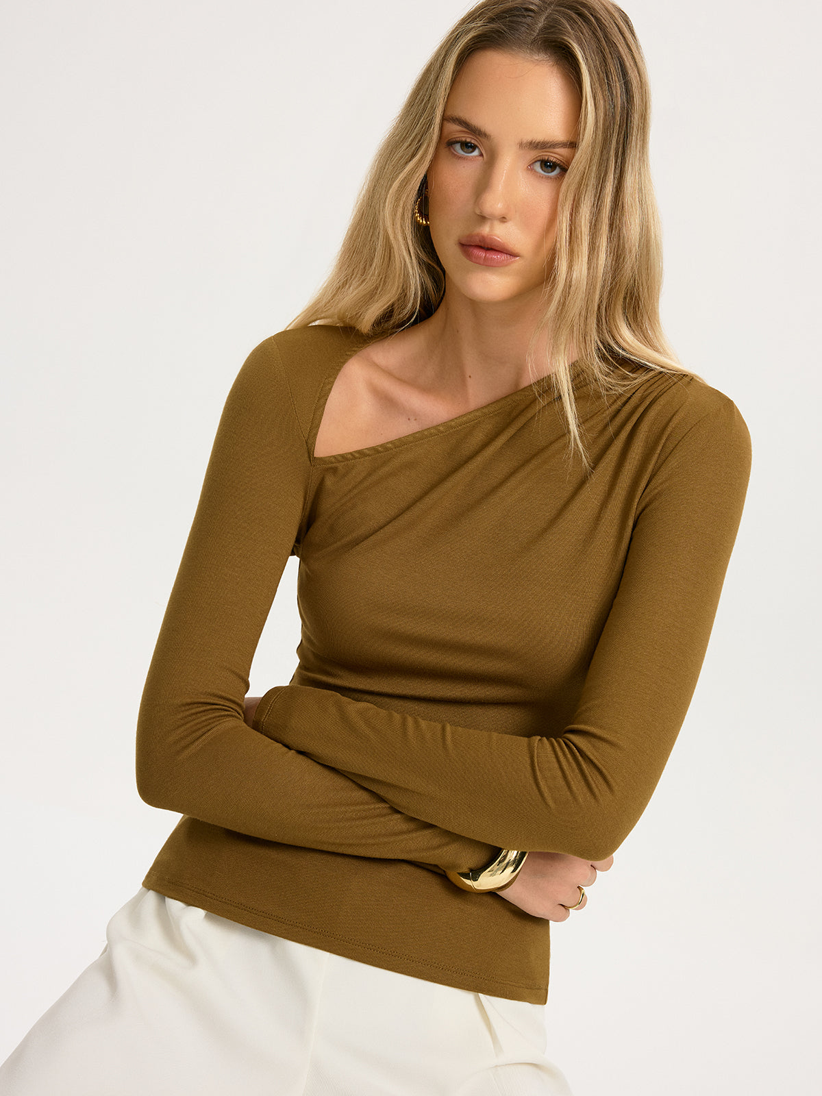 asymmetrical neck,casual,clothing,coll:knitwear,coll:tops,corpcore,fall,feminine,green,high stretch,in_six_month,jersey,long sleeve,no,not_low_sales,oa251112098,photo_model,regular,slim fit,spring,t-shirts,tops,winter,winter hues,women