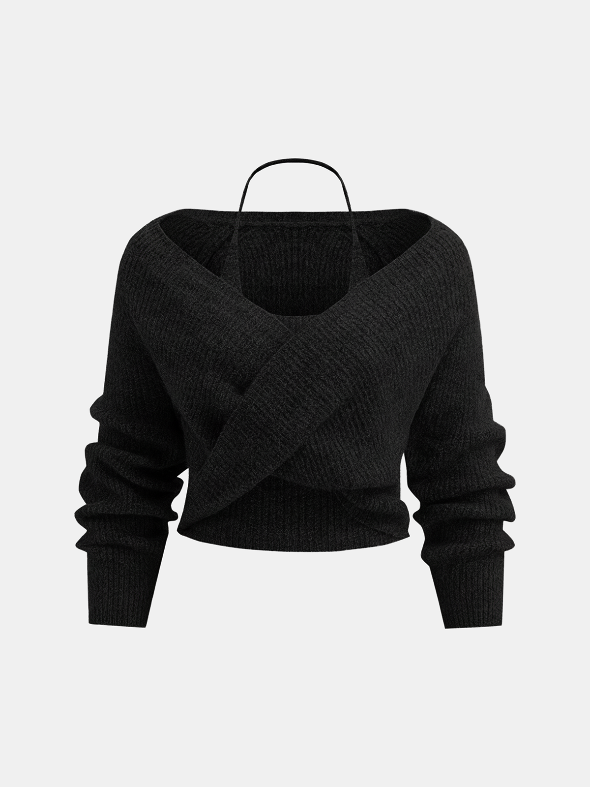 Wool-Blend Two-Piece Set Crossover Halter Knit Top