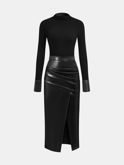 Sleeveless Bodysuit and Faux Leather Skirt Set