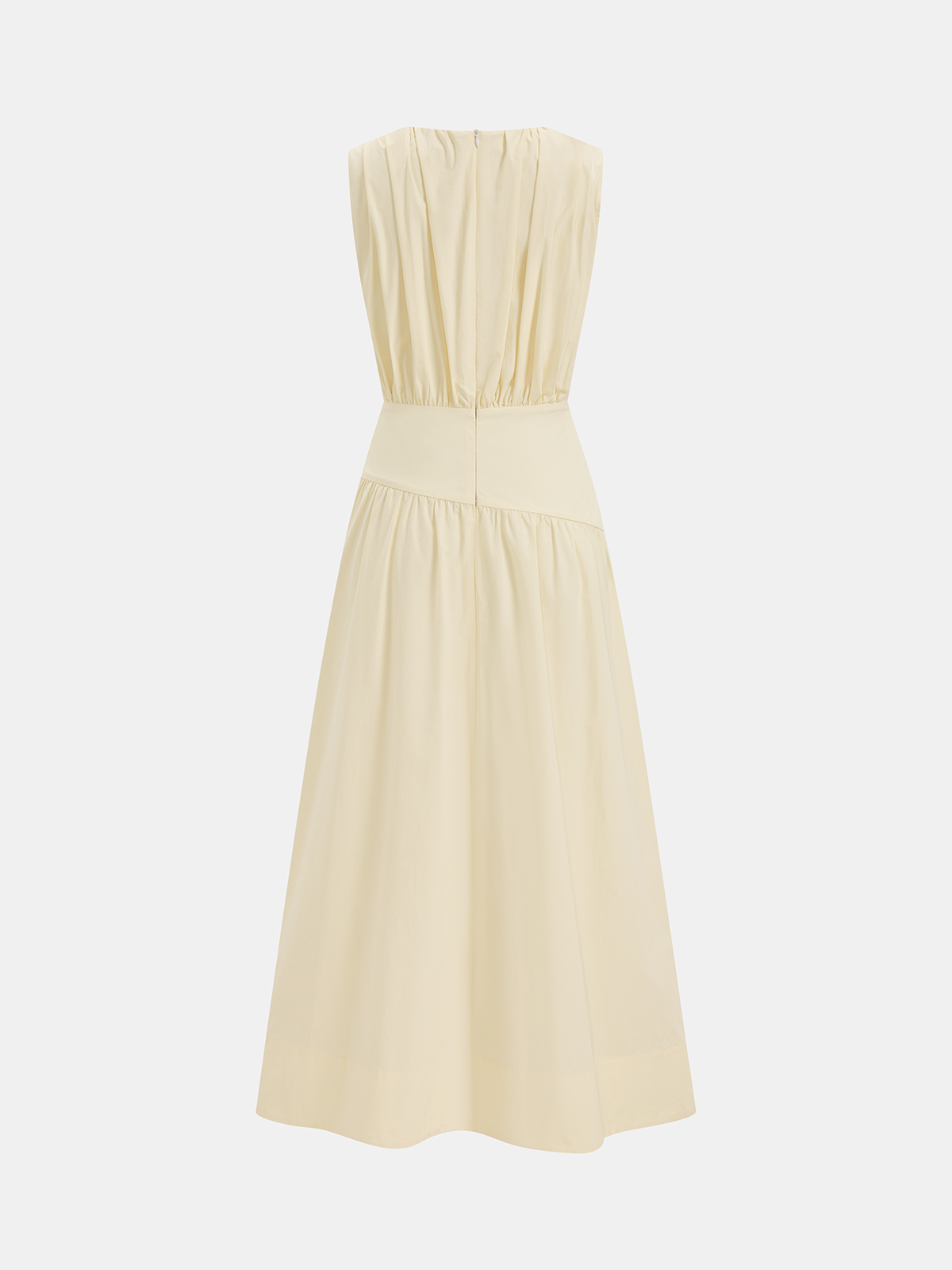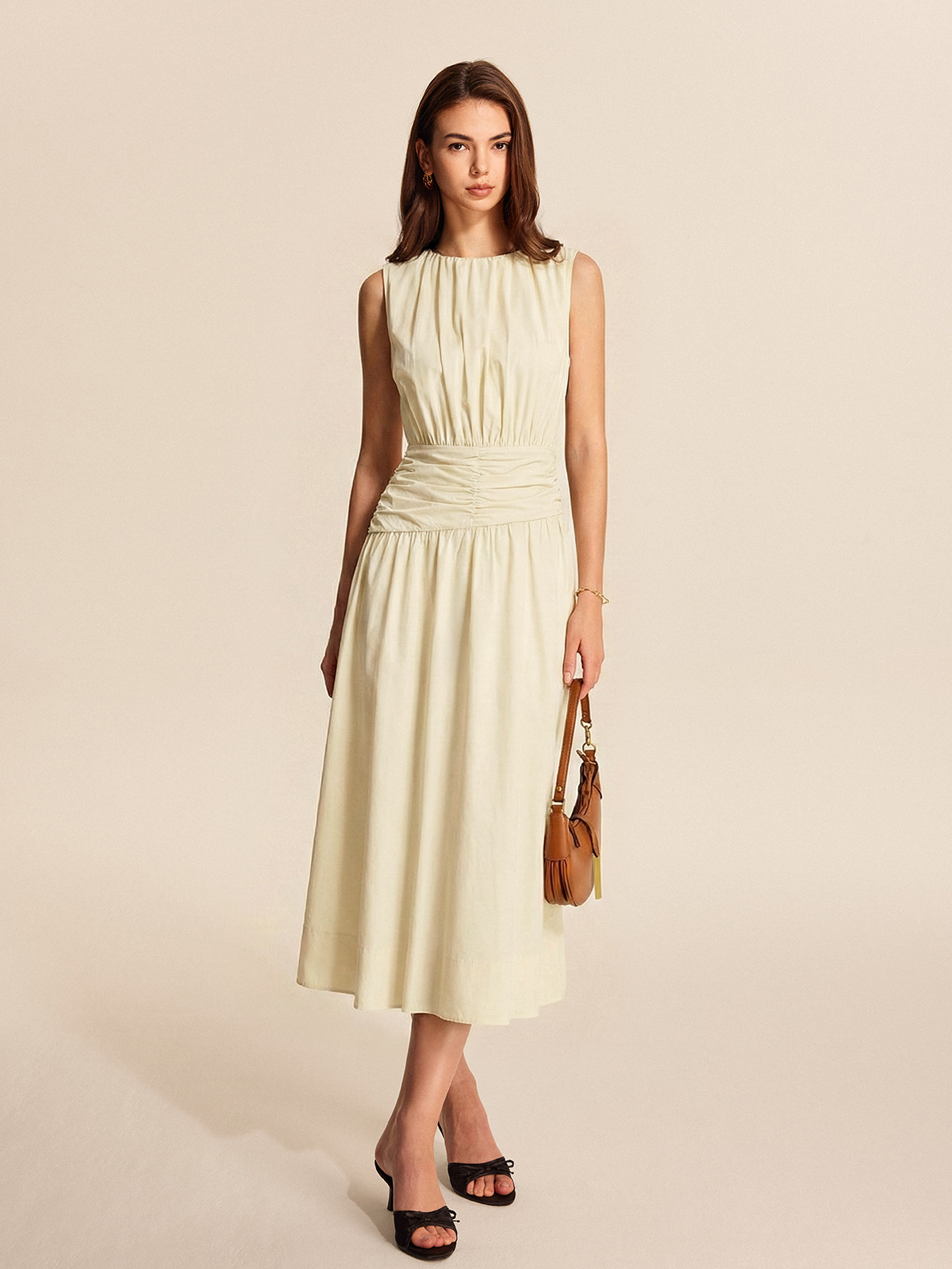 casual,clothing,coll:dresses,coll:vacation,coll:weekend_getaway,crew neck,dresses,in_six_month,invisible zipper,lightyellow,midi,minegence,no,non-stretch,not_low_sales,oa251215011,photo_ai,regular,regular fit,ruched,sleeveless,umbrella hem,vacation,women,woven fabric