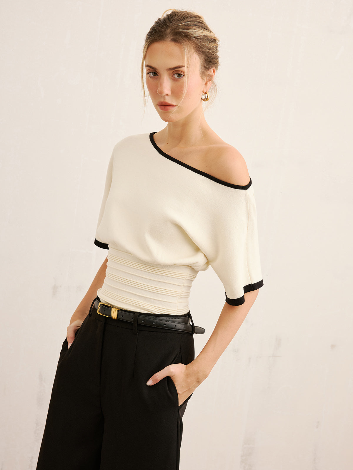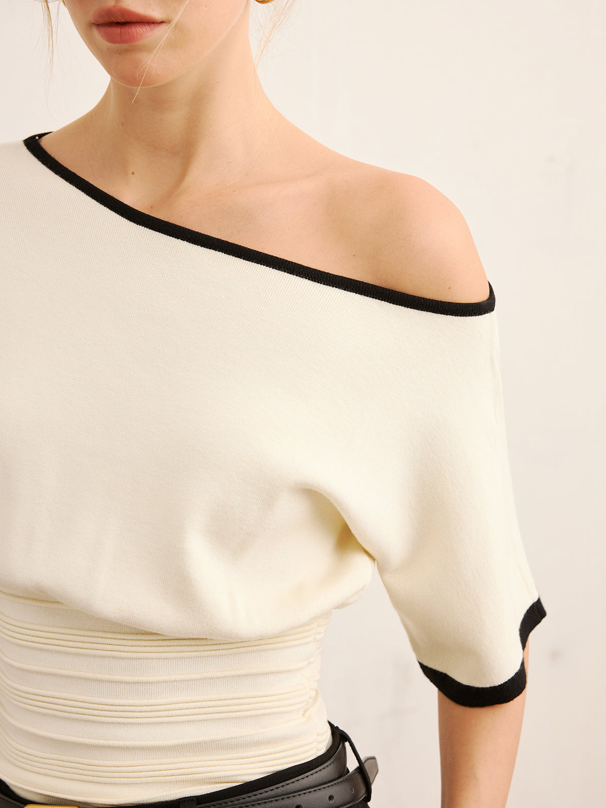 Contrast Trim Cinched Waist Knit Top