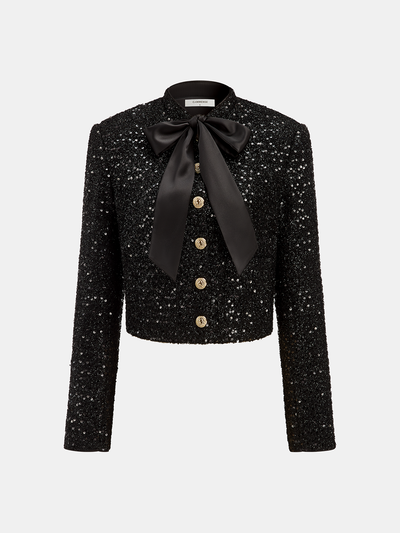 Bow Detail Sequined Tweed Cropped Jacket