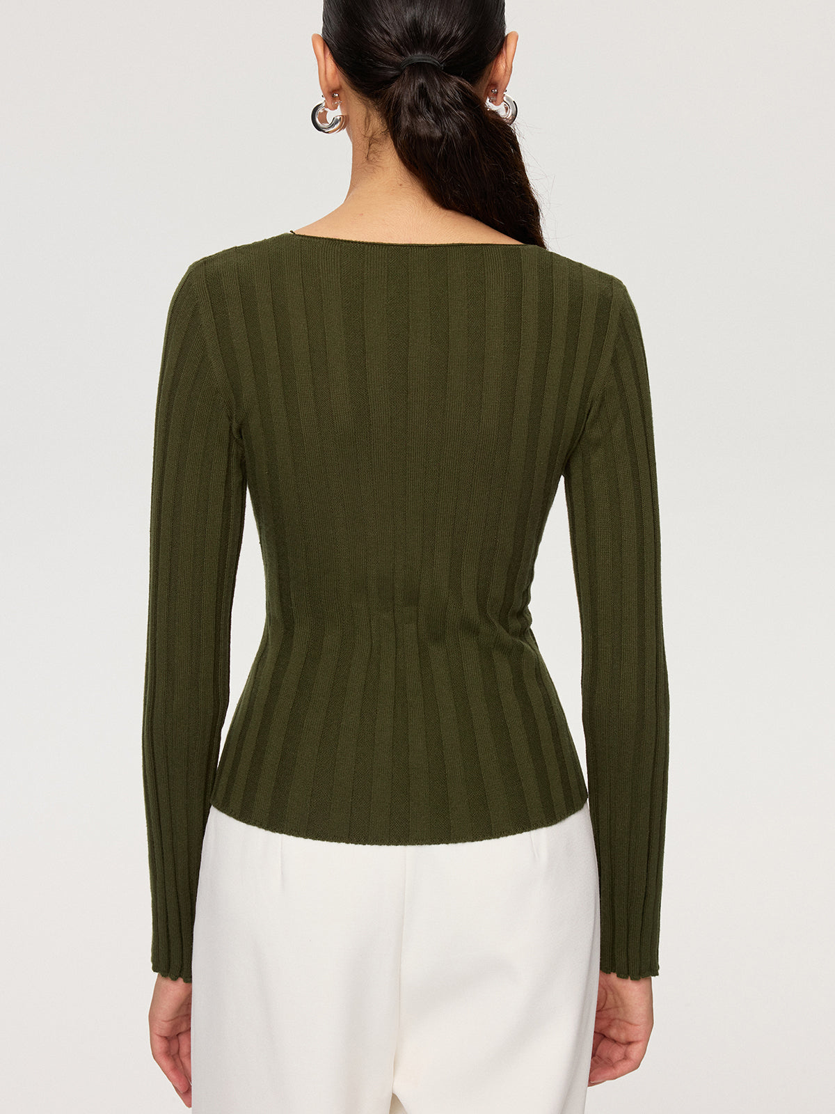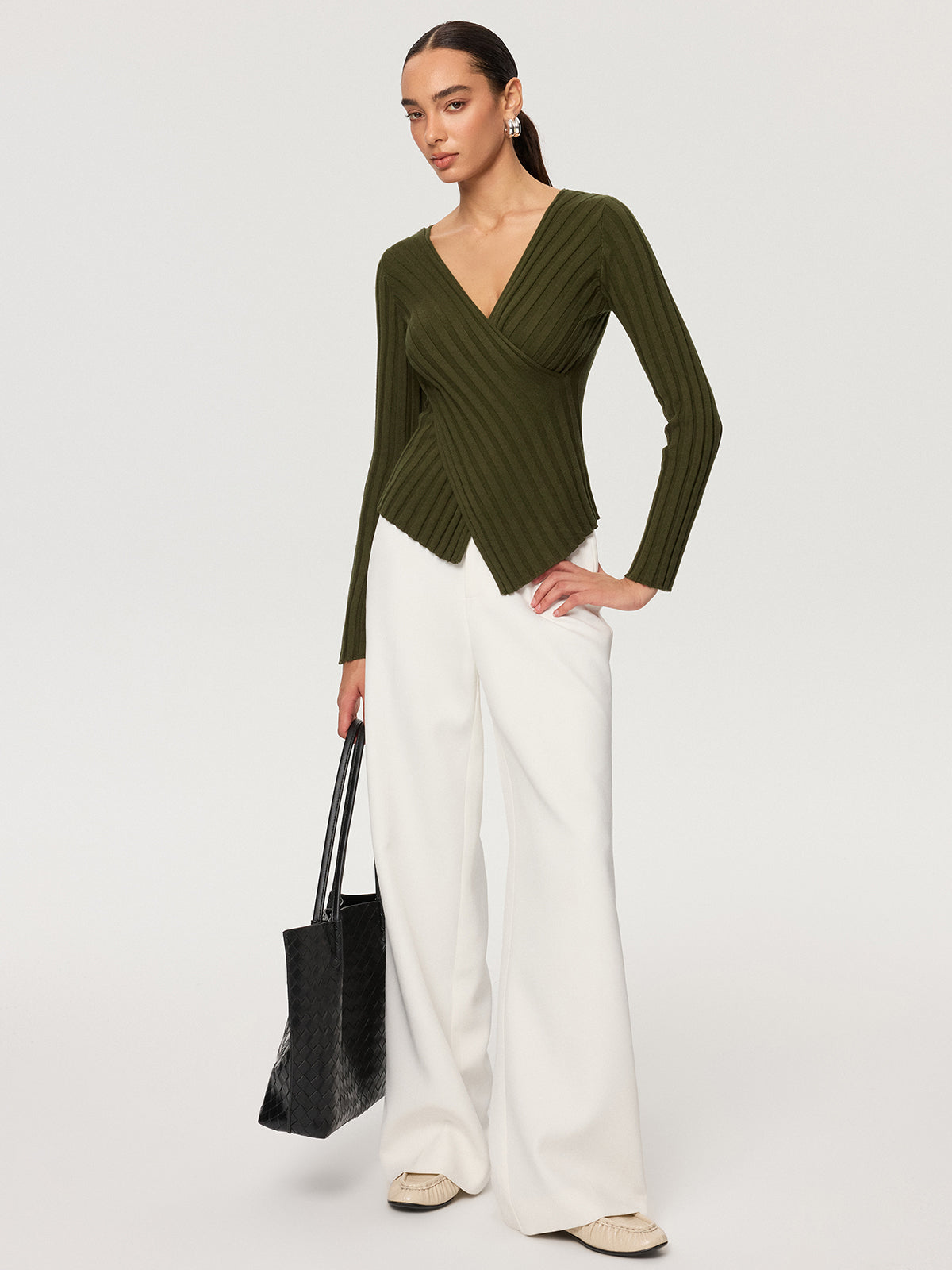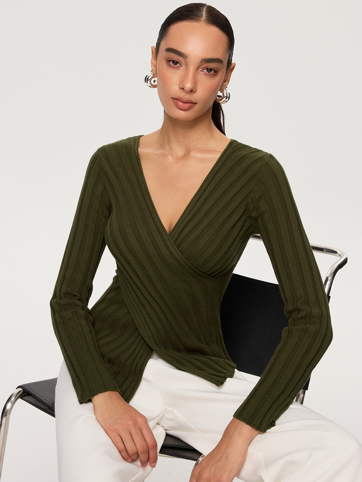 Cross-Over V-Neck Fitted Ribbed Knit Top
