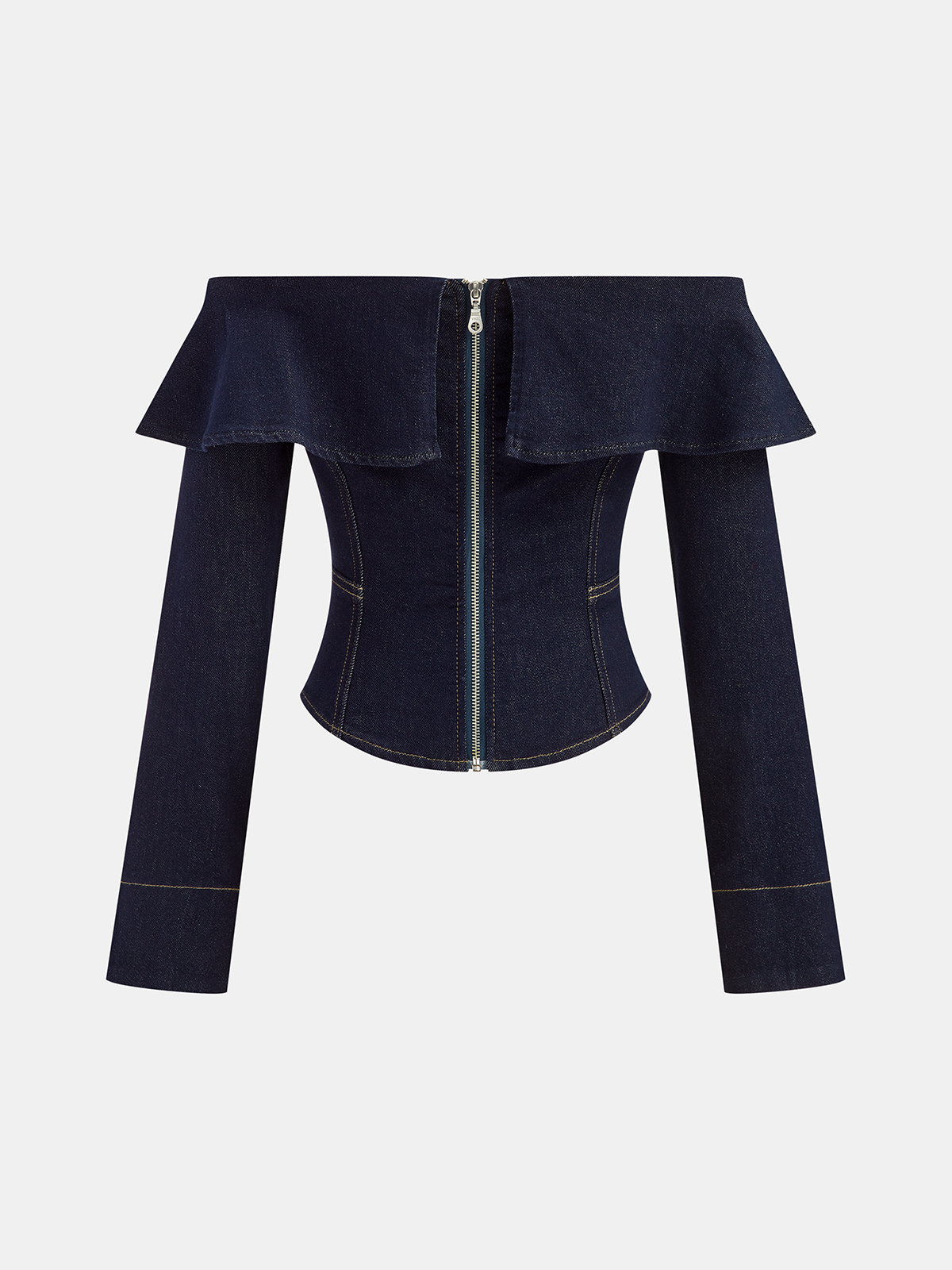 casual,clothing,coll:denim,coll:tops,corpcore,denim,denim tops,fall,in_six_month,inner sample,long sleeve,minegence,navy,no,not_low_sales,oa250722091,regular,ruffle,short top,slight stretch,slim fit,spring,straight neck,tops,women
