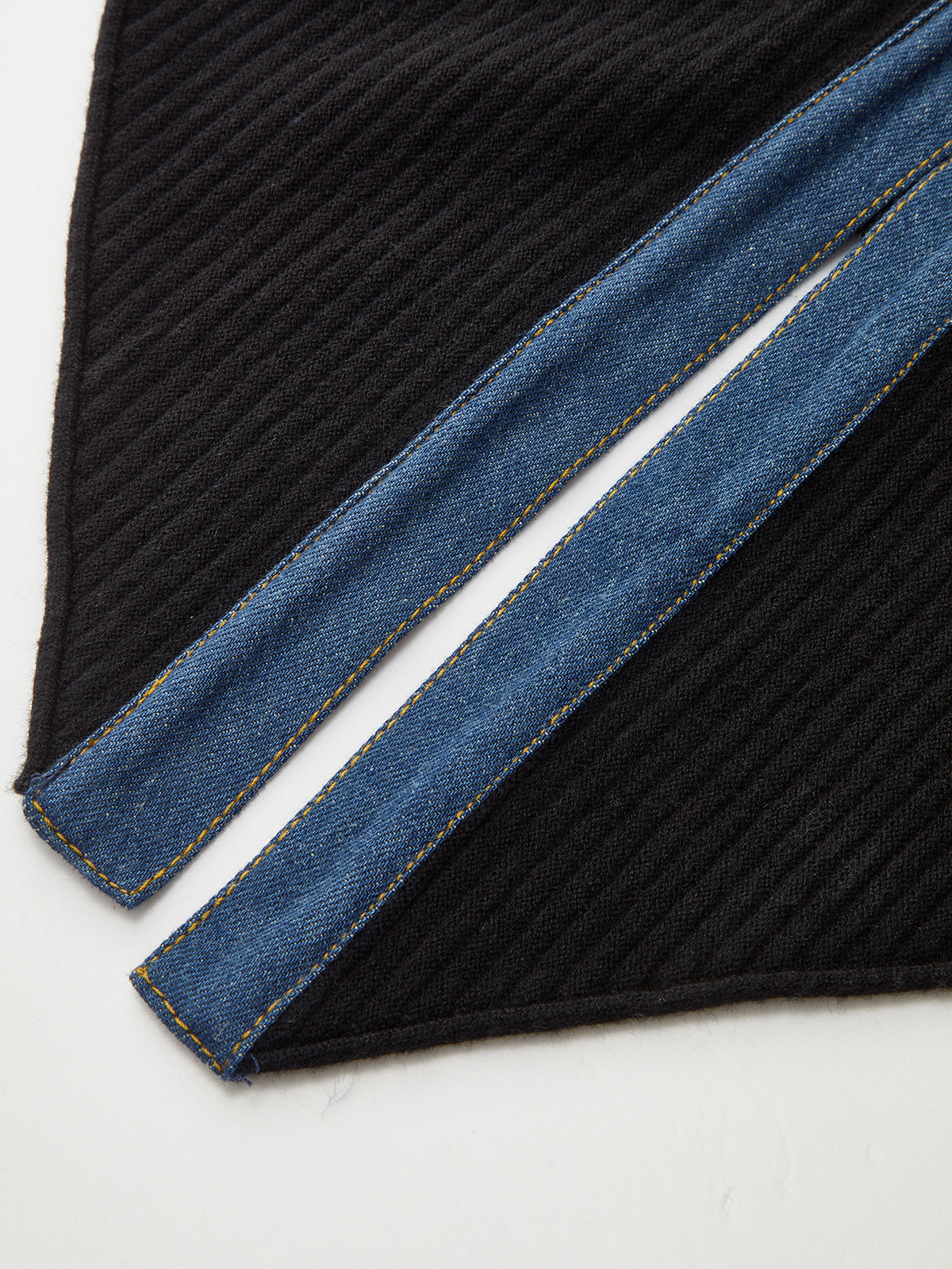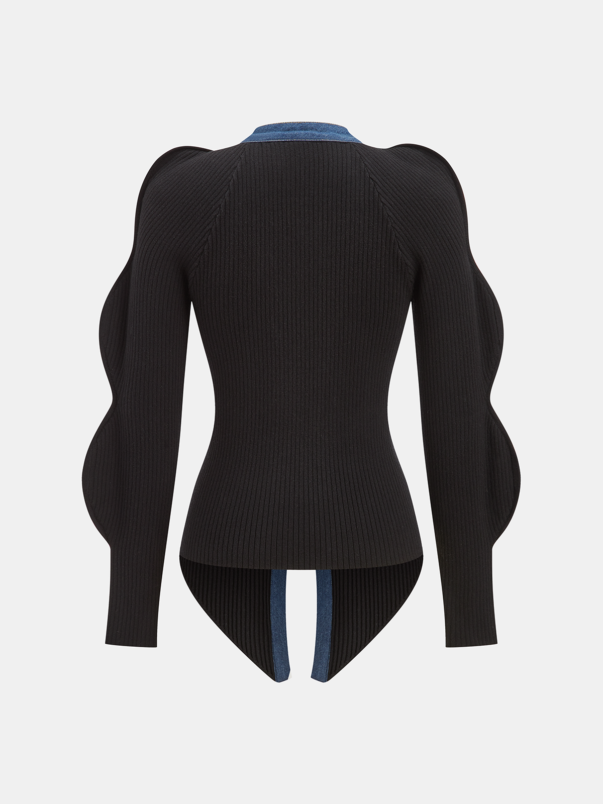 Scalloped Sleeve Denim Paneled Ribbed Cardigan