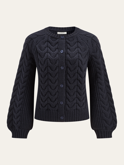 Denim Collar Cable Knit Button-Front Peplum Cardigan