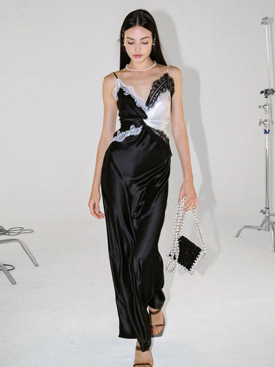 Lace Detail Backless Two-Tone Satin Cami Dress