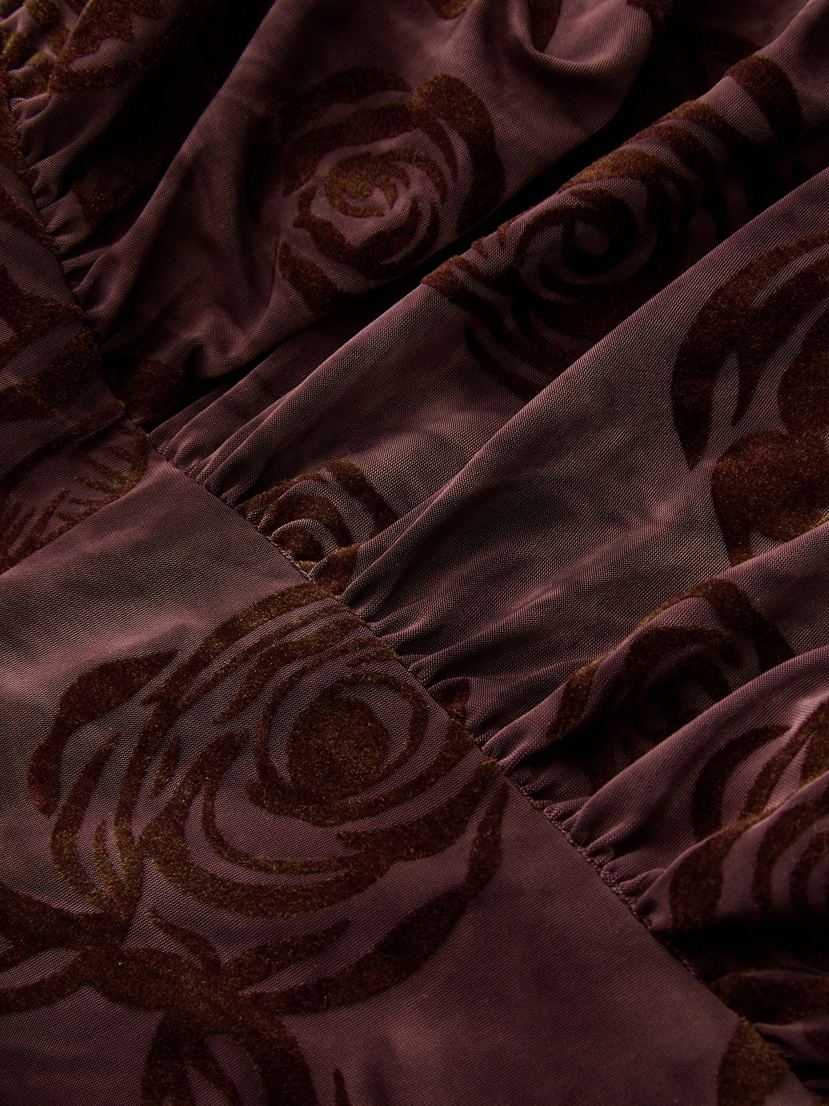 Flocked Rose-Print Ruched Sleeveless Mini Dress