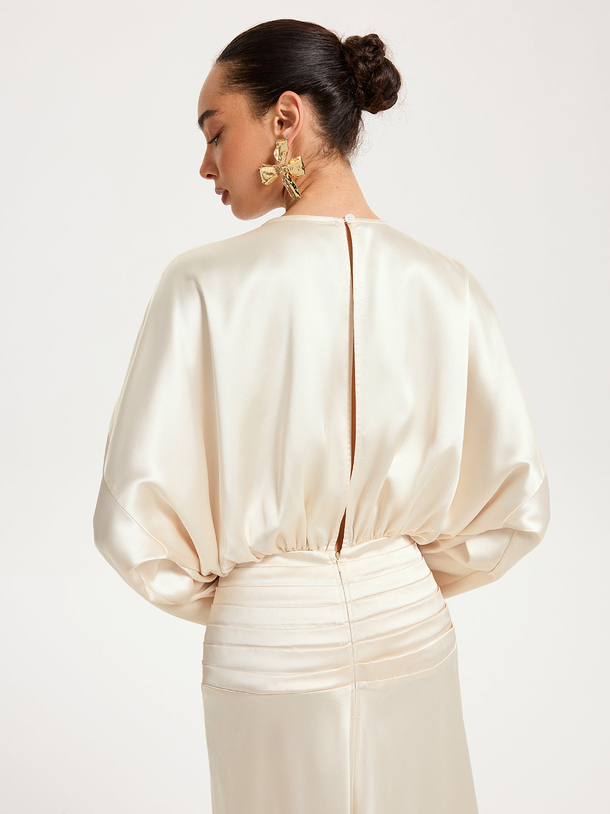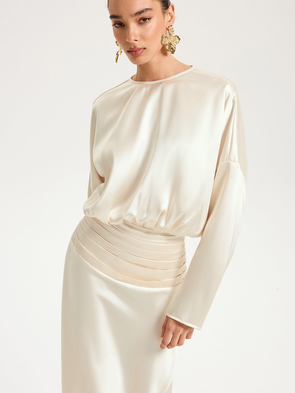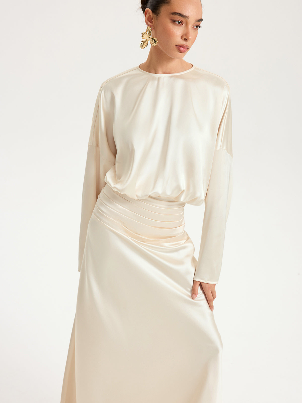 Satin Long Sleeve Pleated Waist Maxi Dress