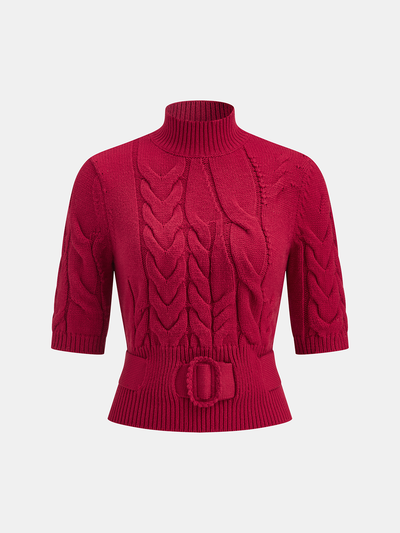 Turtleneck Cable Knit Short Sleeve Belted Sweater