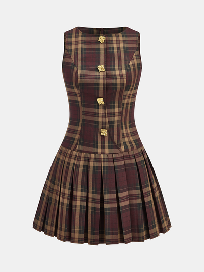 Metal Detail Plaid Sleeveless Pleated Mini Dress