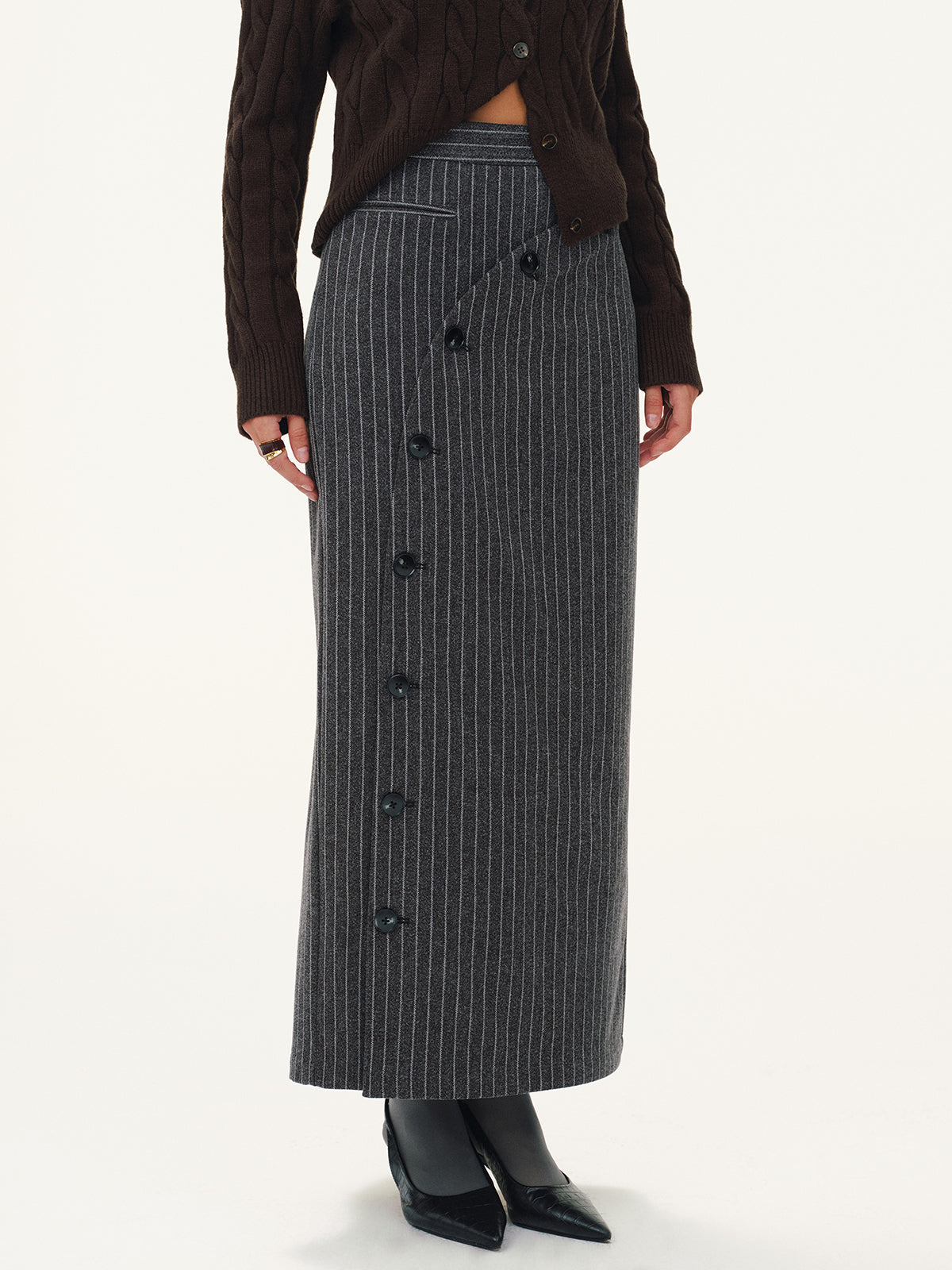 Asymmetric Button Striped Maxi Skirt