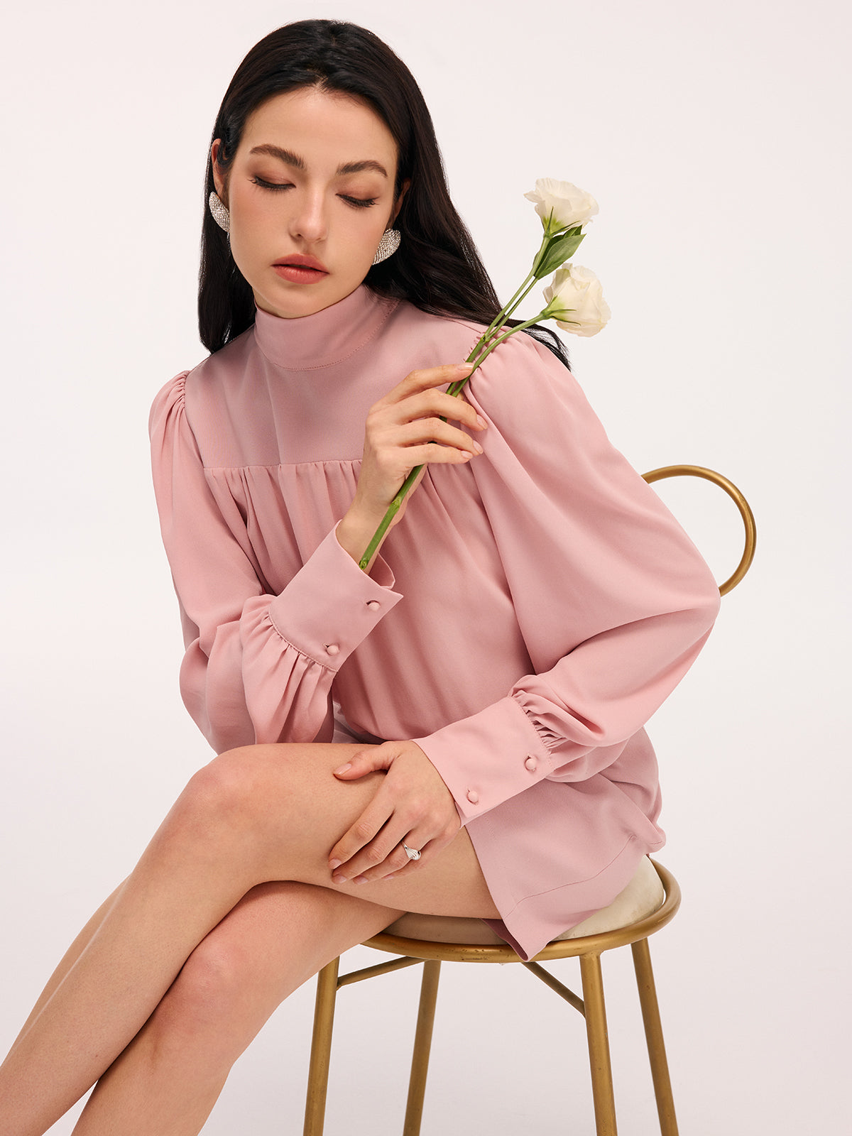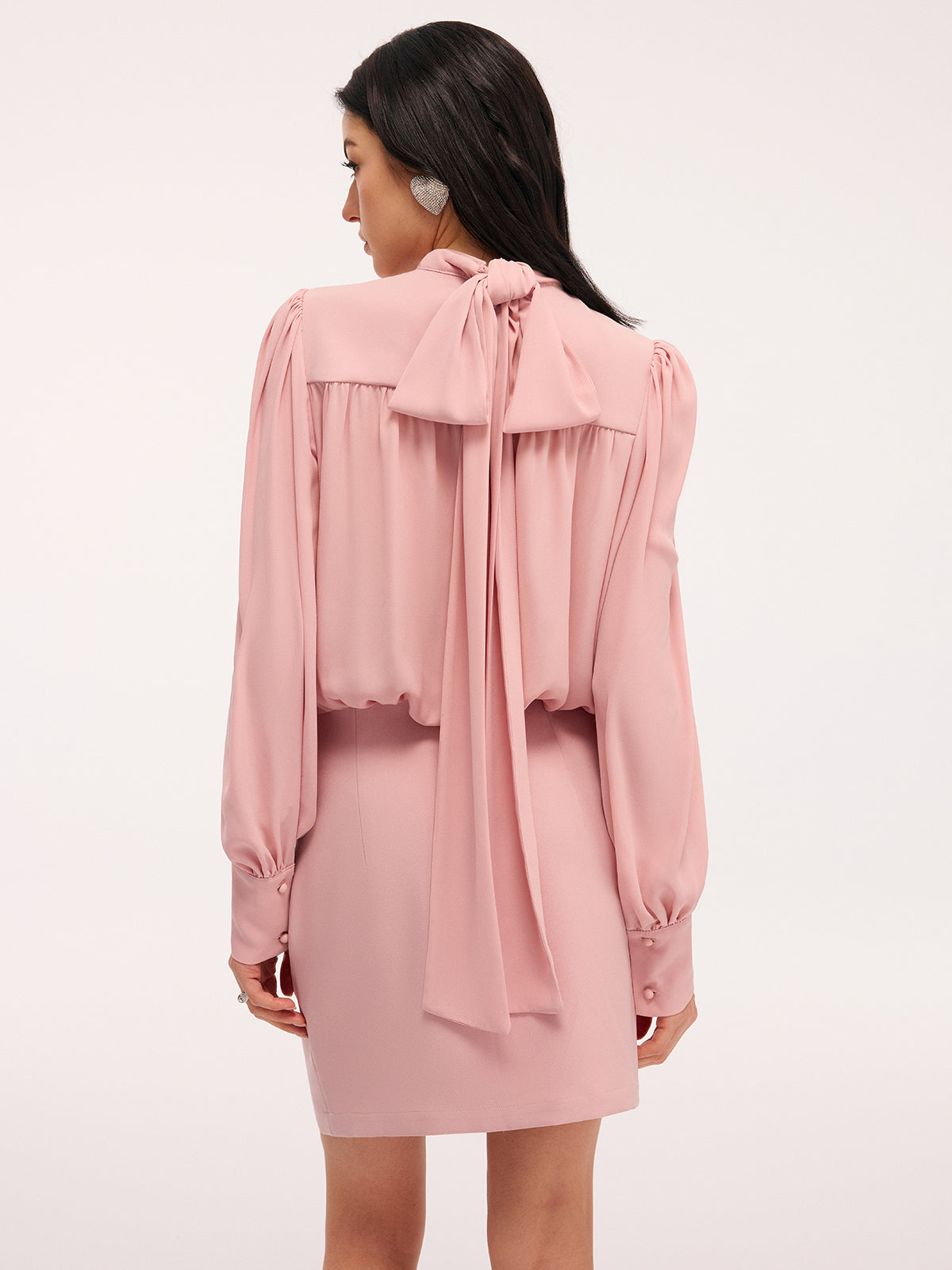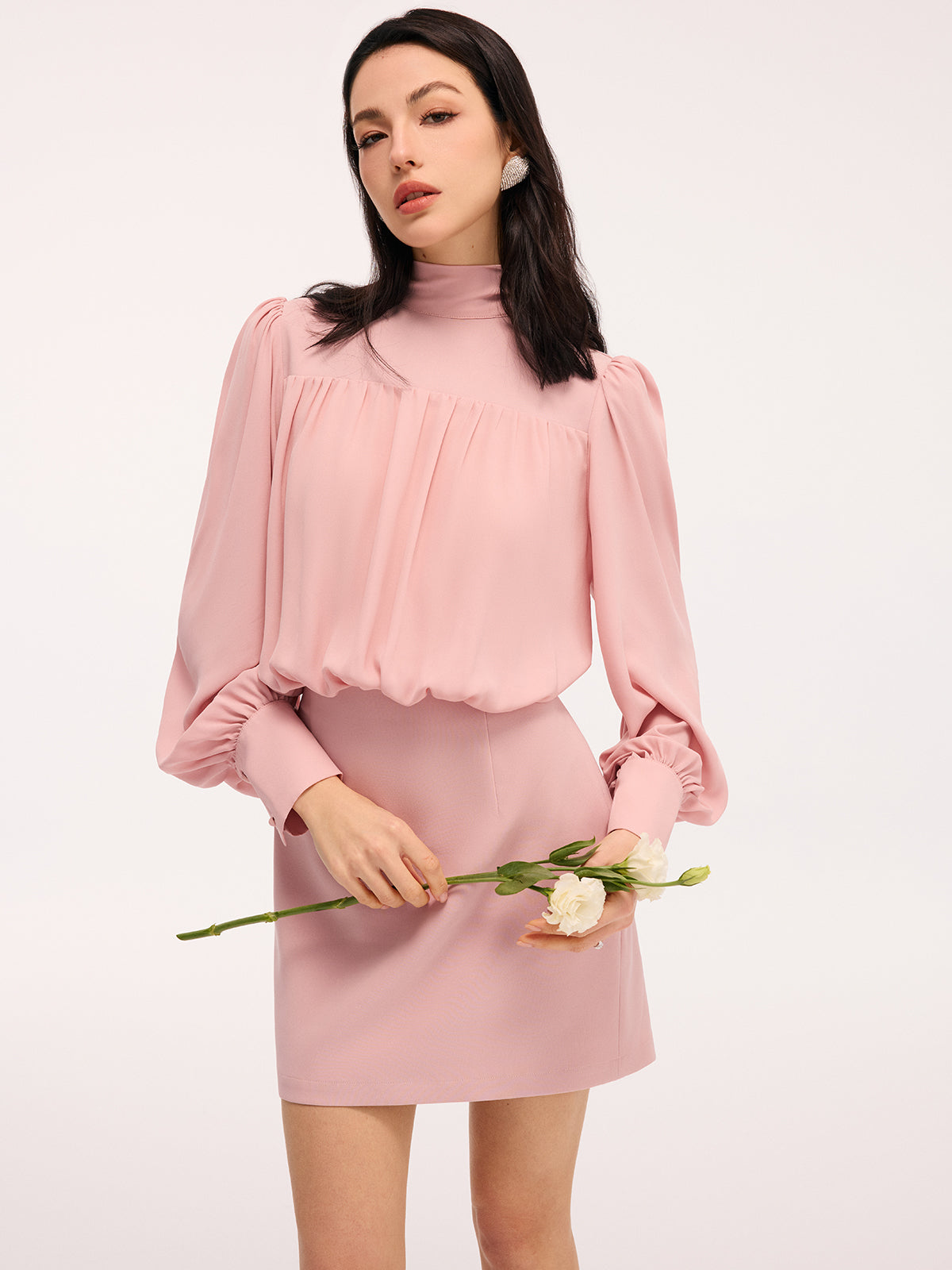casual,chiffon,clothing,coll:dresses,date,dresses,feminine,in_six_month,invisible zipper,long sleeve,mock neck,no,not_low_sales,oa251115061,photo_model,pink,regular,regular fit,ruched,season of love,short,slight stretch,women,woven fabric
