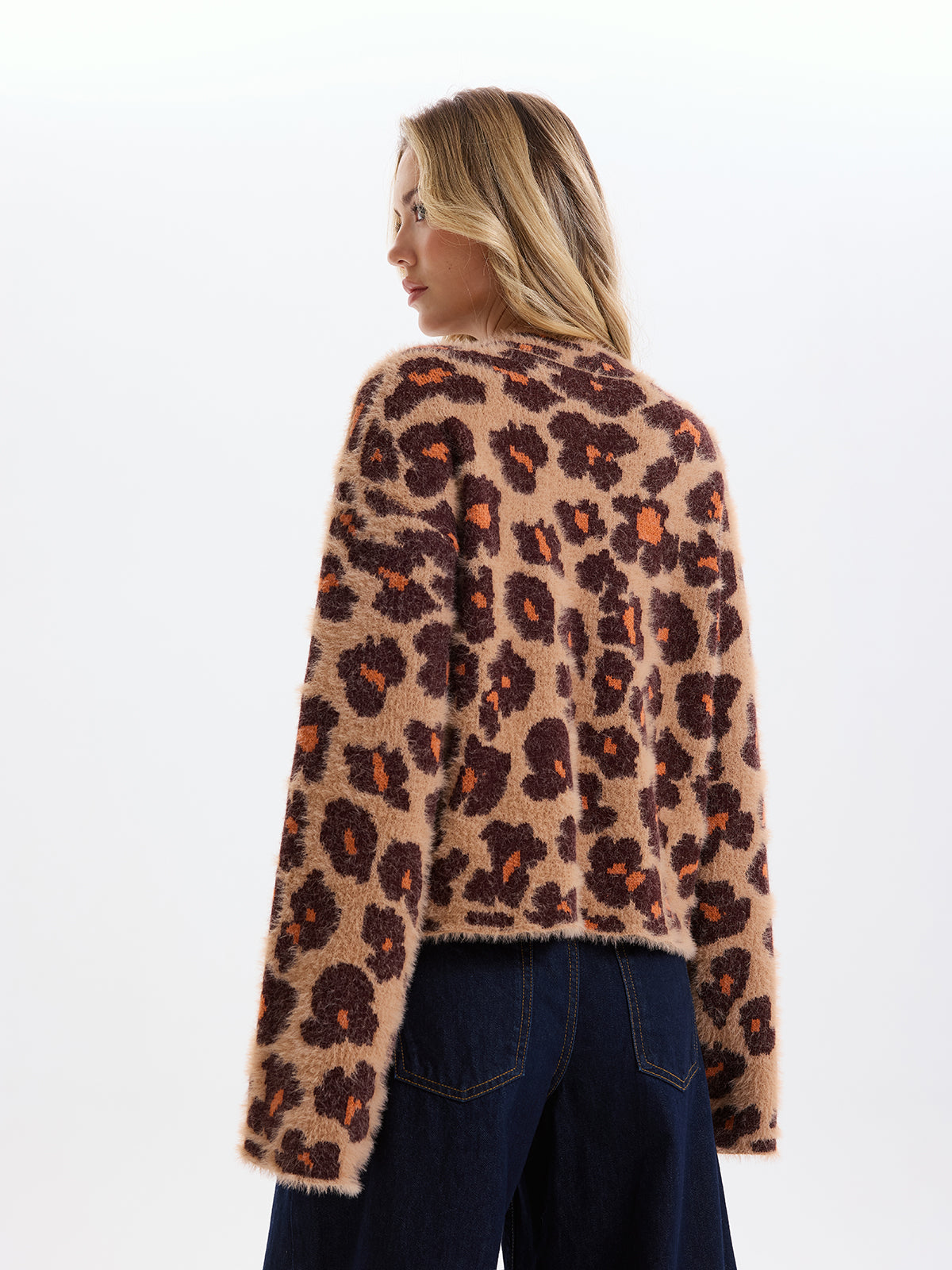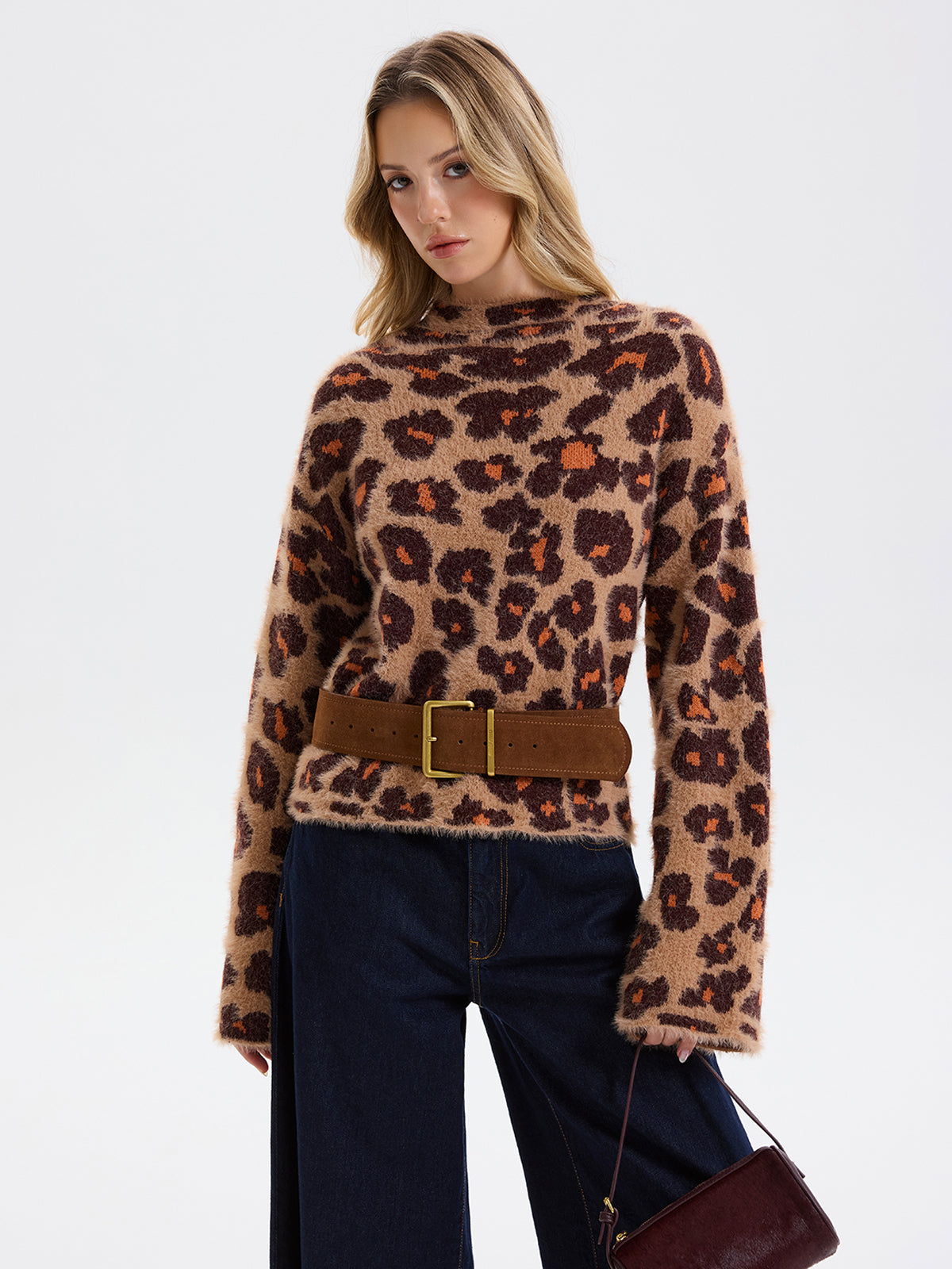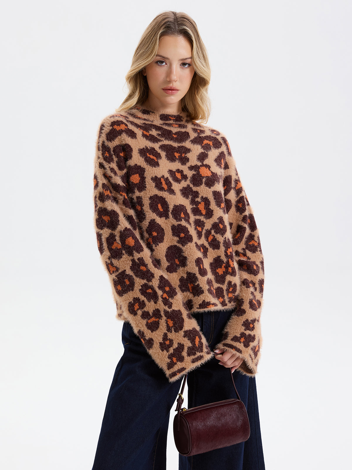 Loose Leopard Jacquard Fuzzy Sweater without Belt