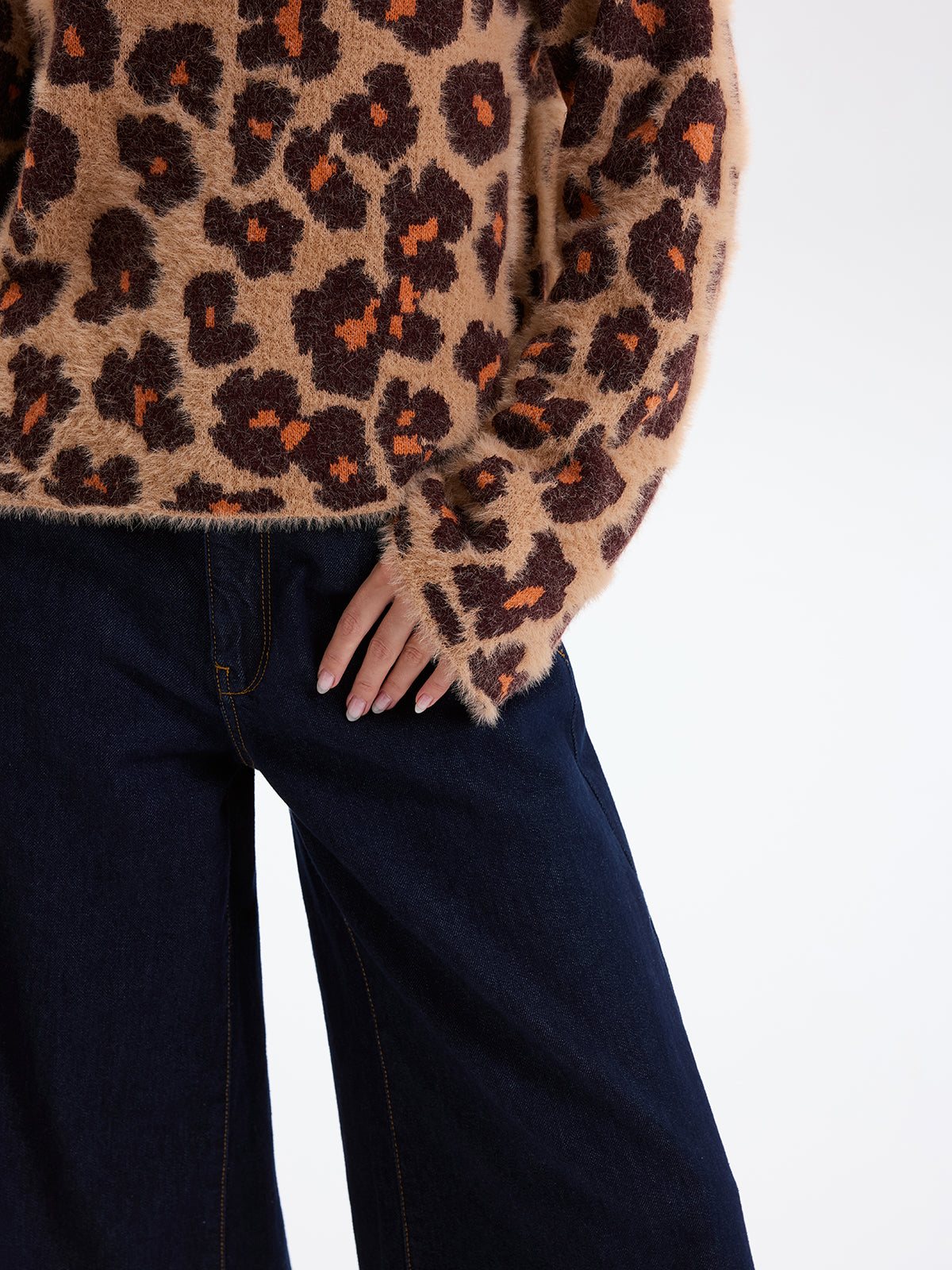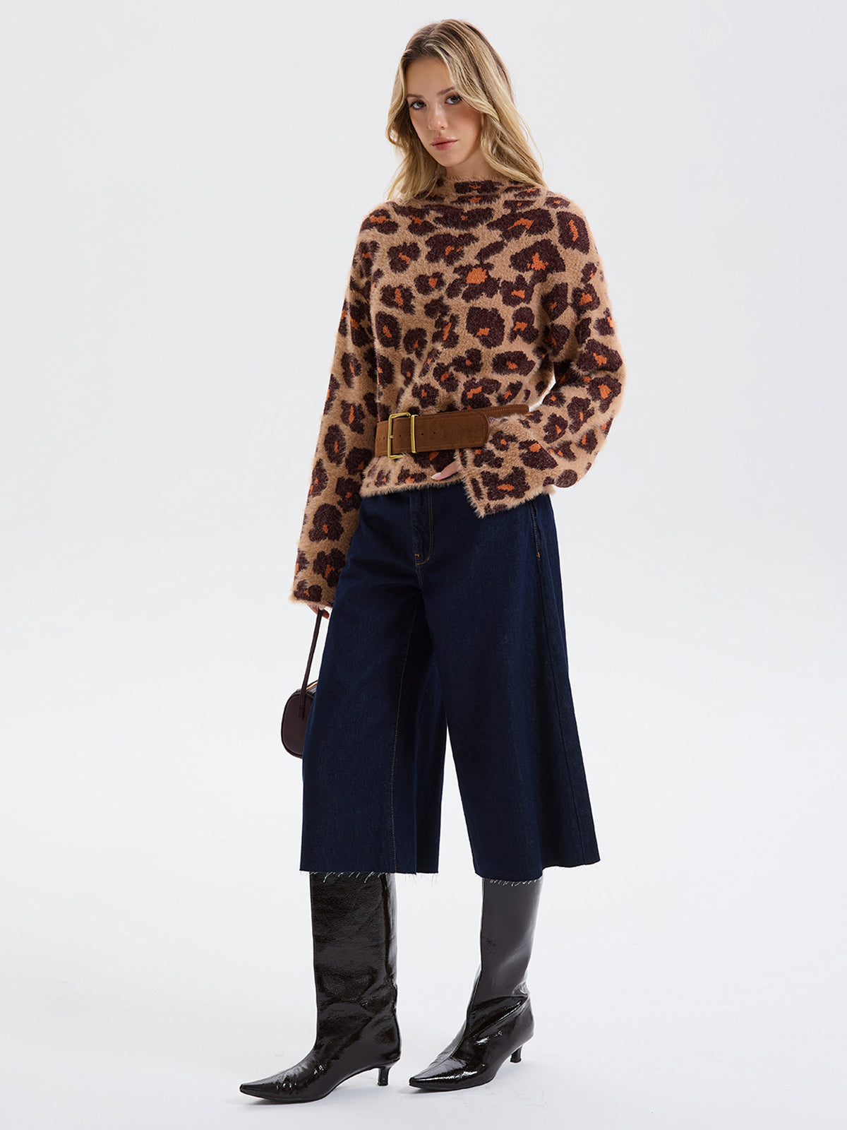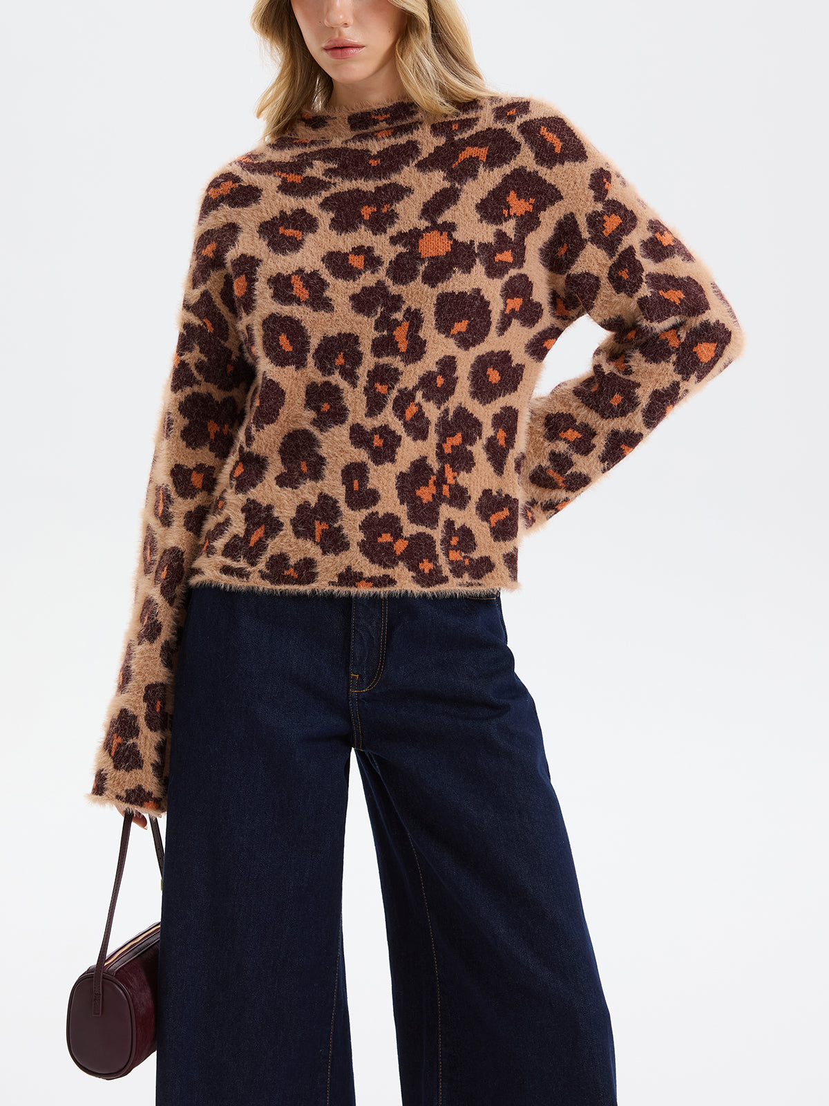 Loose Leopard Jacquard Fuzzy Sweater without Belt