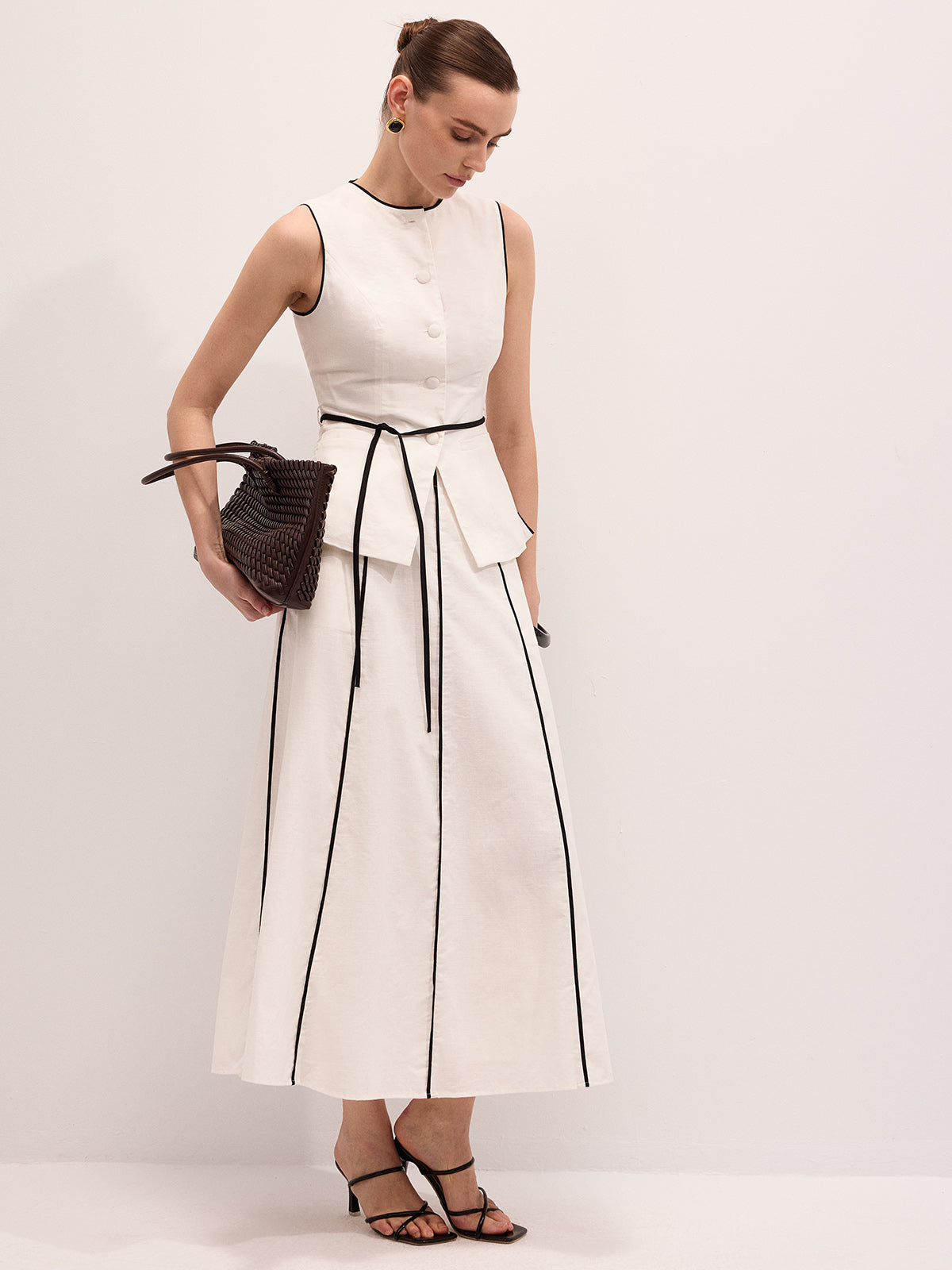 belted,casual,clothing,coll:linen_cotton,coll:matching_sets,coll:skirts,contrast piping / trim,corpcore,cotton&linen,crew neck,in_six_month,midi,minegence,non-stretch,not_low_sales,oa260119051,photo_model,regular,regular fit,sets,skirt sets,sleeveless,the linen ease,umbrella hem,white,women