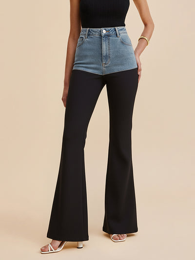 Mid-Waist Denim Panel Flared Pants