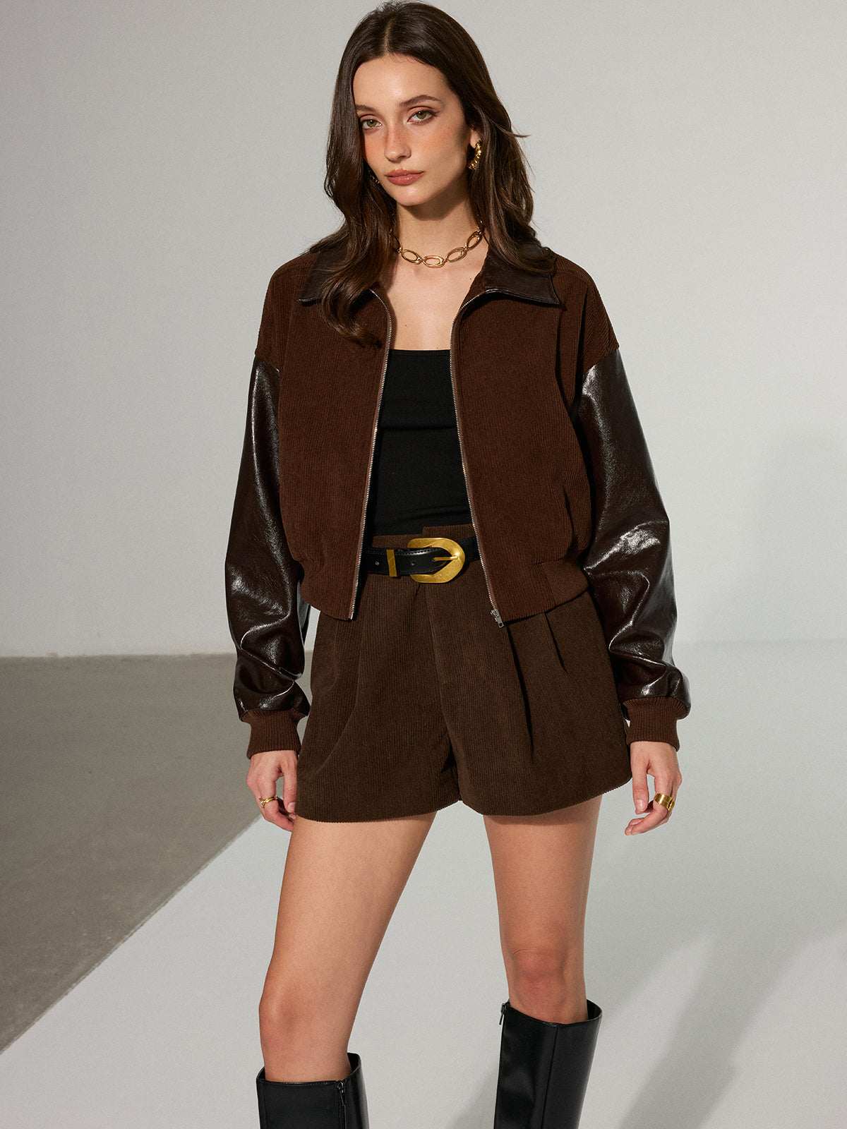 bottoms,casual,clothing,coll:bottoms,coll:matching_sets,coll:shorts,corduroy,daily,dark brown,fall,fff,in_six_month,inner sample,matching sets,no,non belted,not_low_sales,oa250710028,patchwork,photo_model,regular,regular fit,short pants,shorts,slight stretch,winter,women